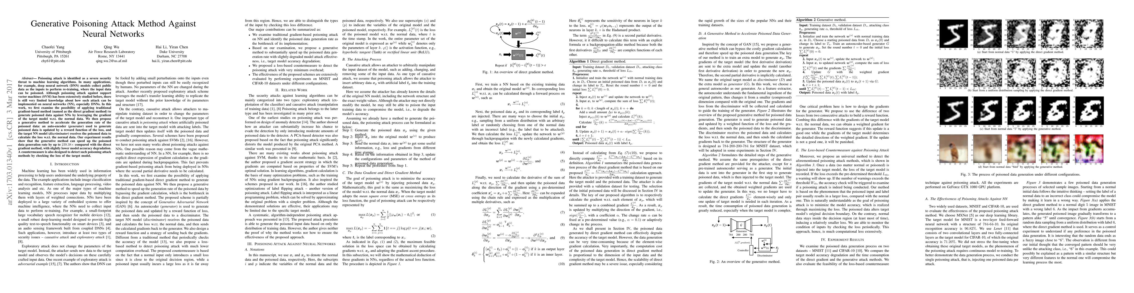 This paper investigates a generative poisoning attack method against neural networks, specifically deep neural networks (DNNs). The authors propose a generative auto-encoder to accelerate poisoned data generation, achieving a 239.38x speedup compared to traditional gradient-based methods, and introduce a countermeasure to detect such attacks.
