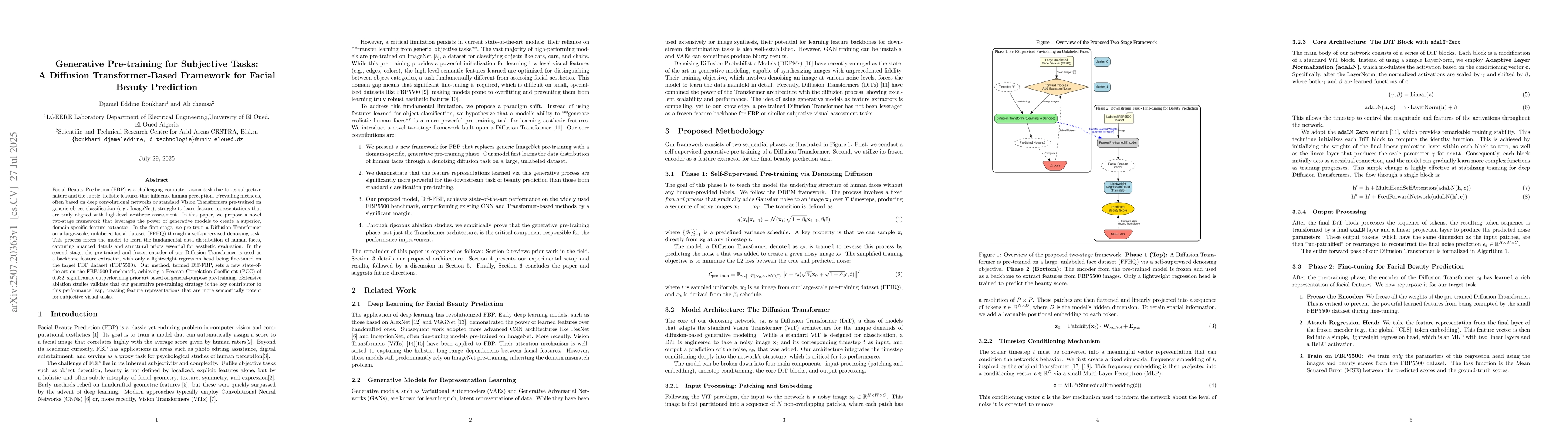 Facial Beauty Prediction (FBP) is a challenging computer vision task due to its subjective nature and the subtle, holistic features that influence human perception. Prevailing methods, often based on deep convolutional networks or standard Vision Transformers pre-trained on generic object classification (e.g., ImageNet), struggle to learn feature representations that are truly aligned with high-level aesthetic assessment. In this paper, we propose a novel two-stage framework that leverages the power of generative models to create a superior, domain-specific feature extractor. In the first stage, we pre-train a Diffusion Transformer on a large-scale, unlabeled facial dataset (FFHQ) through a self-supervised denoising task. This process forces the model to learn the fundamental data distribution of human faces, capturing nuanced details and structural priors essential for aesthetic evaluation. In the second stage, the pre-trained and frozen encoder of our Diffusion Transformer is used as a backbone feature extractor, with only a lightweight regression head being fine-tuned on the target FBP dataset (FBP5500). Our method, termed Diff-FBP, sets a new state-of-the-art on the FBP5500 benchmark, achieving a Pearson Correlation Coefficient (PCC) of 0.932, significantly outperforming prior art based on general-purpose pre-training. Extensive ablation studies validate that our generative pre-training strategy is the key contributor to this performance leap, creating feature representations that are more semantically potent for subjective visual tasks.