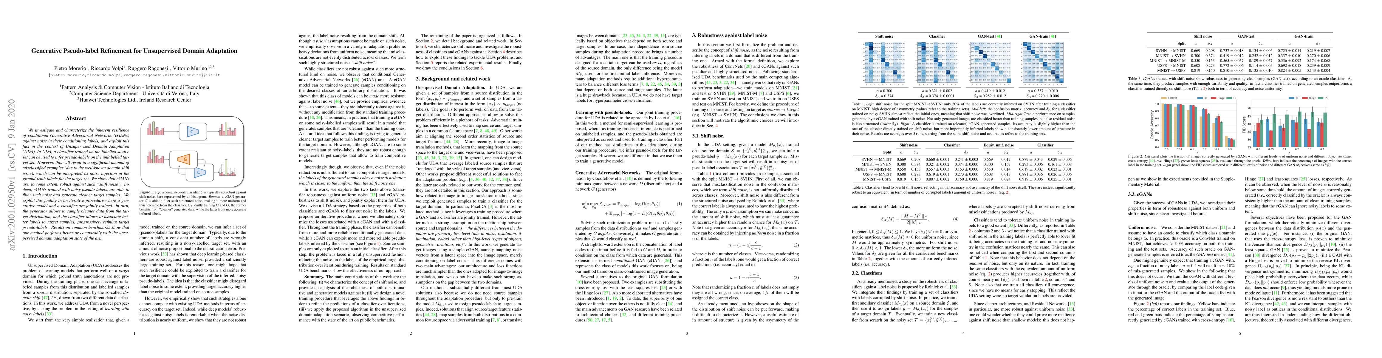We investigate and characterize the inherent resilience of conditional Generative Adversarial Networks (cGANs) against noise in their conditioning labels, and exploit this fact in the context of Unsupervised Domain Adaptation (UDA). In UDA, a classifier trained on the labelled source set can be used to infer pseudo-labels on the unlabelled target set. However, this will result in a significant amount of misclassified examples (due to the well-known domain shift issue), which can be interpreted as noise injection in the ground-truth labels for the target set. We show that cGANs are, to some extent, robust against such "shift noise". Indeed, cGANs trained with noisy pseudo-labels, are able to filter such noise and generate cleaner target samples. We exploit this finding in an iterative procedure where a generative model and a classifier are jointly trained: in turn, the generator allows to sample cleaner data from the target distribution, and the classifier allows to associate better labels to target samples, progressively refining target pseudo-labels. Results on common benchmarks show that our method performs better or comparably with the unsupervised domain adaptation state of the art.