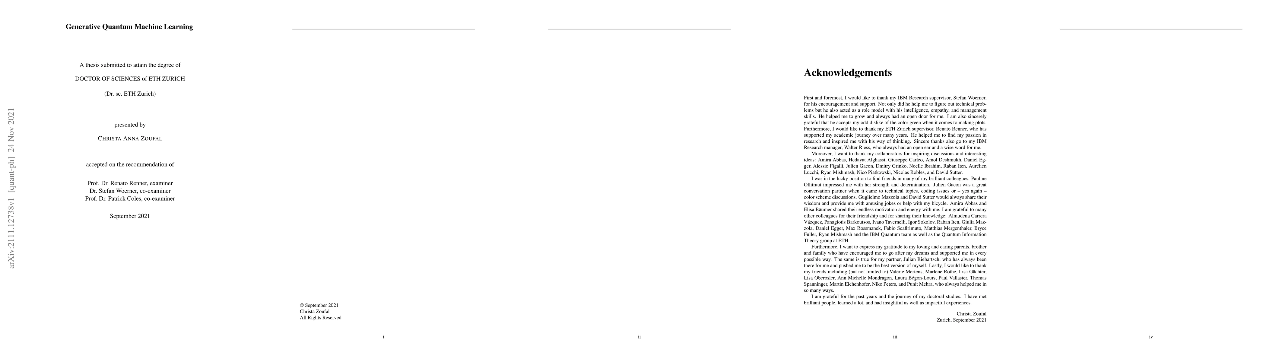 This paper explores the development of generative quantum machine learning algorithms that leverage quantum resources to model and generate data samples. It proposes quantum generative adversarial networks and quantum Boltzmann machines, aiming to enhance performance and provide insights beyond classical methods, while also addressing efficient quantum data loading.