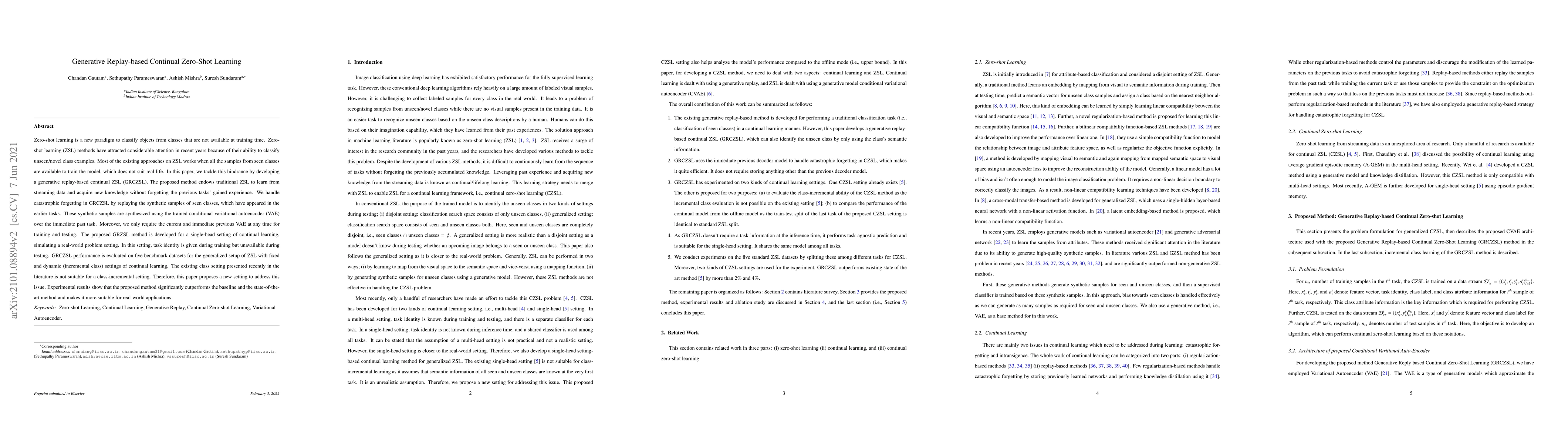 This paper introduces a generative replay-based continual zero-shot learning (GRCZSL) method to address the challenge of catastrophic forgetting in zero-shot learning when training on streaming data. The proposed approach synthesizes synthetic samples of seen classes using a conditional VAE, enabling continual learning without losing previous knowledge.