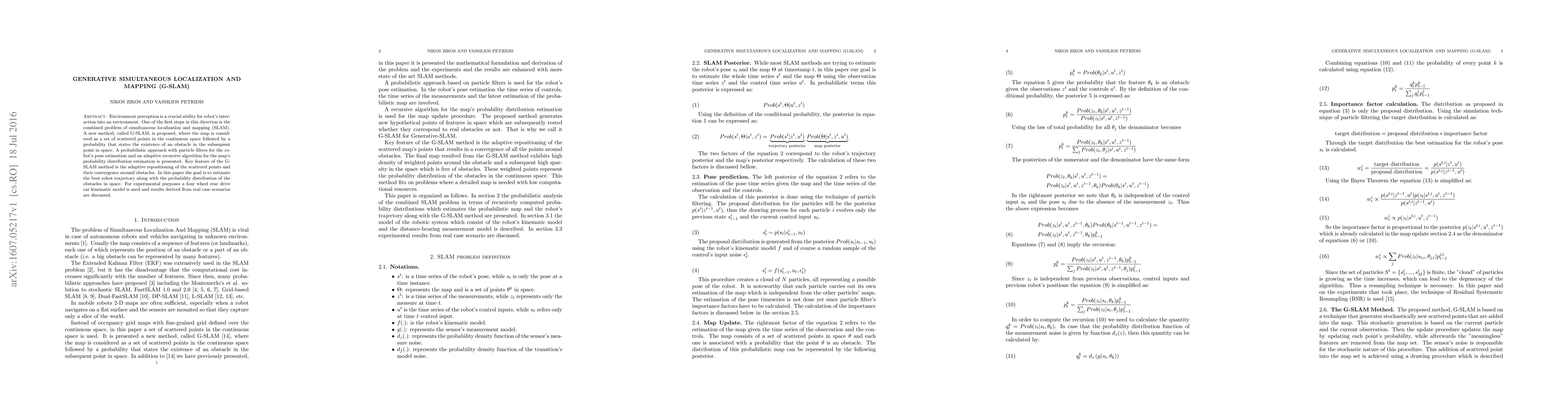 The paper proposes G-SLAM, a method for simultaneous localization and mapping using a probabilistic approach with particle filters and adaptive recursive algorithms. The method adaptively repositions scattered points to converge around obstacles, aiming to estimate the optimal robot trajectory and the probability distribution of obstacles. Experimental results using a four-wheel rear drive car model are presented.