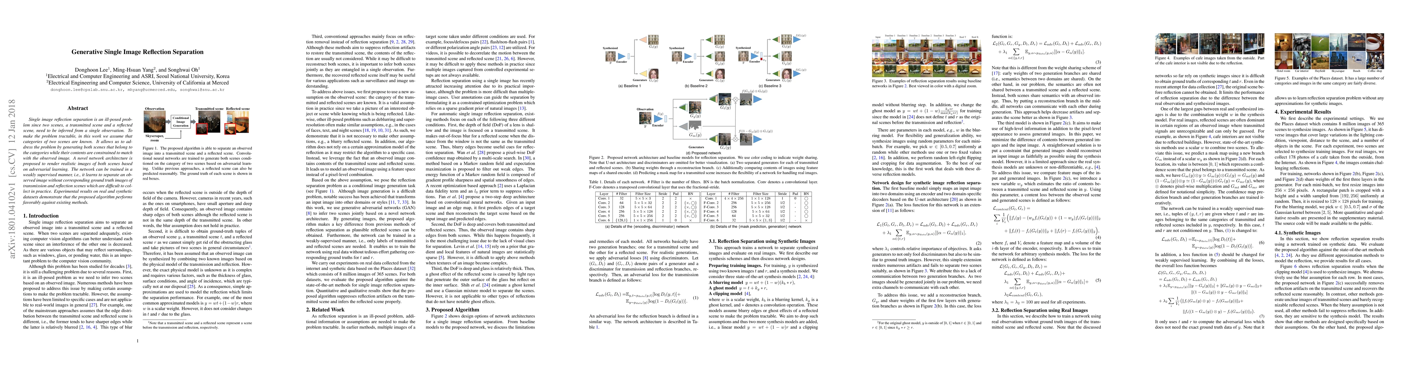 This paper proposes a novel network architecture for separating reflections in single images by generating inferred transmitted and reflected scenes using adversarial learning, trained in a weakly supervised manner without requiring ground truth images. Experimental results show the method outperforms existing techniques.
