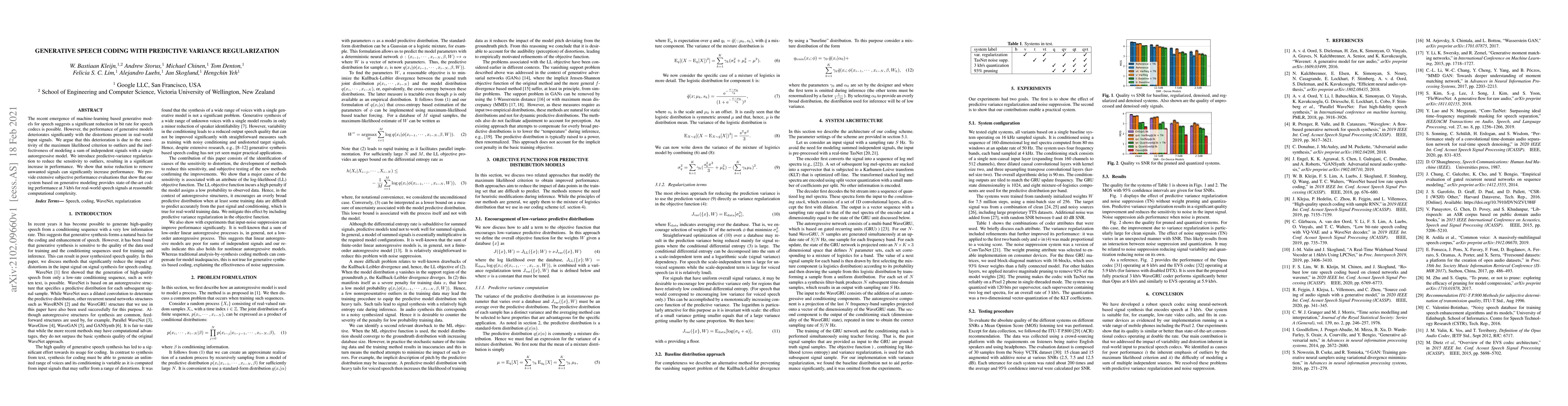 The paper presents predictive variance regularization, a novel approach to reduce sensitivity to outliers in generative speech coding models, combined with noise suppression techniques.