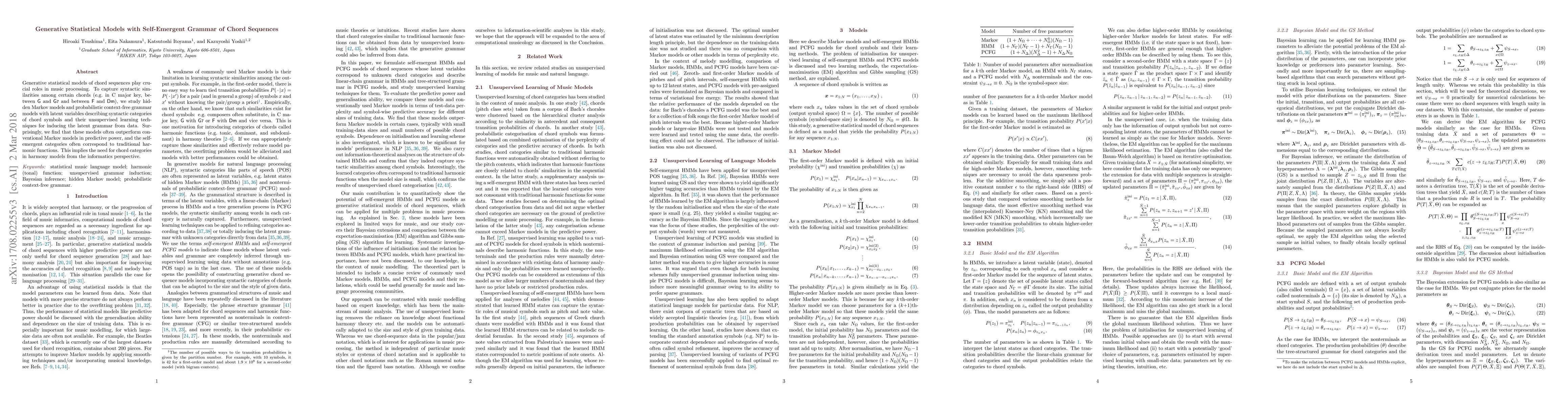 This paper explores generative statistical models for chord sequences, finding that hidden Markov models and probabilistic context-free grammars with latent variables outperform conventional models. The self-emergent categories often align with traditional harmonic functions, suggesting the importance of chord categories in music informatics.