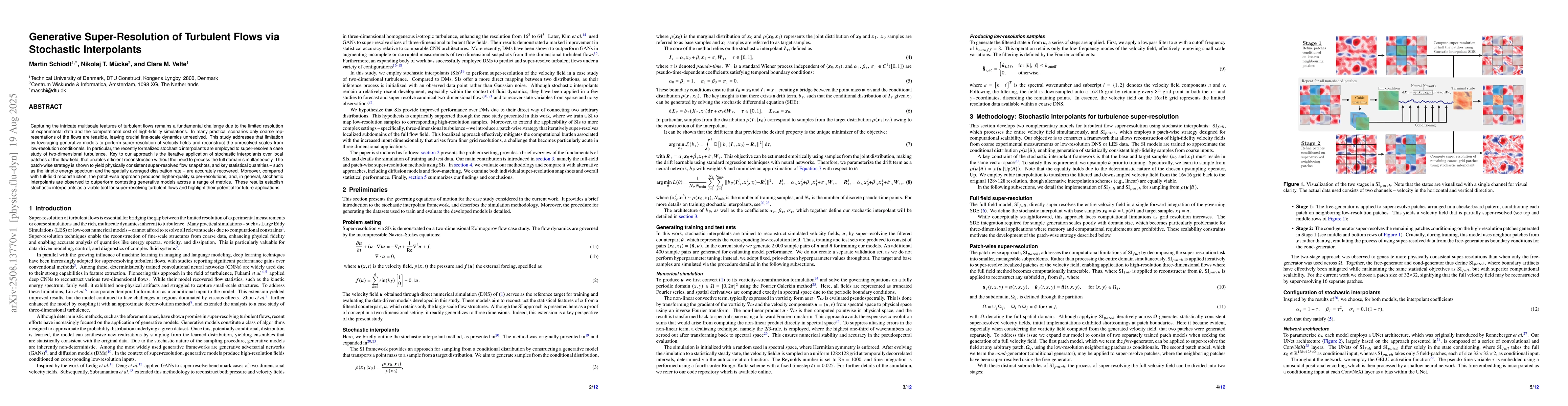 Capturing the intricate multiscale features of turbulent flows remains a fundamental challenge due to the limited resolution of experimental data and the computational cost of high-fidelity simulations. In many practical scenarios only coarse representations of the flows are feasible, leaving crucial fine-scale dynamics unresolved. This study addresses that limitation by leveraging generative models to perform super-resolution of velocity fields and reconstruct the unresolved scales from low-resolution conditionals. In particular, the recently formalized stochastic interpolants are employed to super-resolve a case study of two-dimensional turbulence. Key to our approach is the iterative application of stochastic interpolants over local patches of the flow field, that enables efficient reconstruction without the need to process the full domain simultaneously. The patch-wise strategy is shown to yield physically consistent super-resolved flow snapshots, and key statistical quantities -- such as the kinetic energy spectrum and the spatially averaged dissipation rate -- are accurately recovered. Moreover, compared with full-field reconstruction, the patch-wise approach produces higher-quality super-resolutions, and, in general, stochastic interpolants are observed to outperform contesting generative models across a range of metrics. These results establish stochastic interpolants as a viable tool for super-resolving turbulent flows and highlight their potential for future applications.