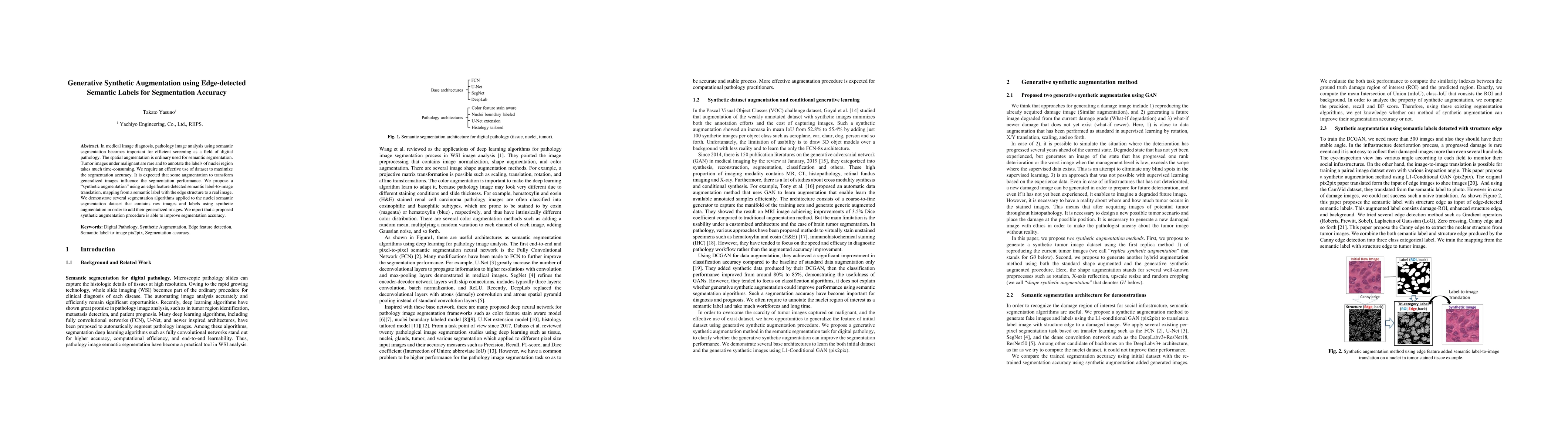 In medical image diagnosis, pathology image analysis using semantic segmentation becomes important for efficient screening as a field of digital pathology. The spatial augmentation is ordinary used for semantic segmentation. Tumor images under malignant are rare and to annotate the labels of nuclei region takes much time-consuming. We require an effective use of dataset to maximize the segmentation accuracy. It is expected that some augmentation to transform generalized images influence the segmentation performance. We propose a synthetic augmentation using label-to-image translation, mapping from a semantic label with the edge structure to a real image. Exactly this paper deal with stain slides of nuclei in tumor. Actually, we demonstrate several segmentation algorithms applied to the initial dataset that contains real images and labels using synthetic augmentation in order to add their generalized images. We computes and reports that a proposed synthetic augmentation procedure improve their accuracy.