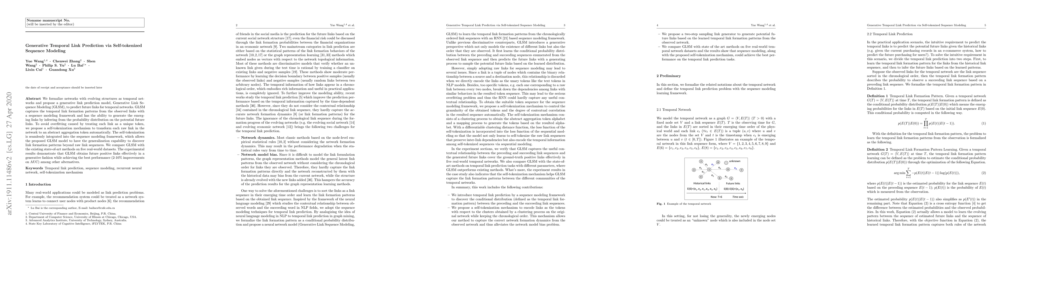 This paper proposes Generative Link Sequence Modeling (GLSM) to predict future links in temporal networks by capturing temporal link formation patterns using a sequence modeling framework. To enhance generalization, it introduces a self-tokenization mechanism that transforms raw links into abstract tokens, achieving better performance (2-10% improvement on AUC) compared to state-of-the-art methods.