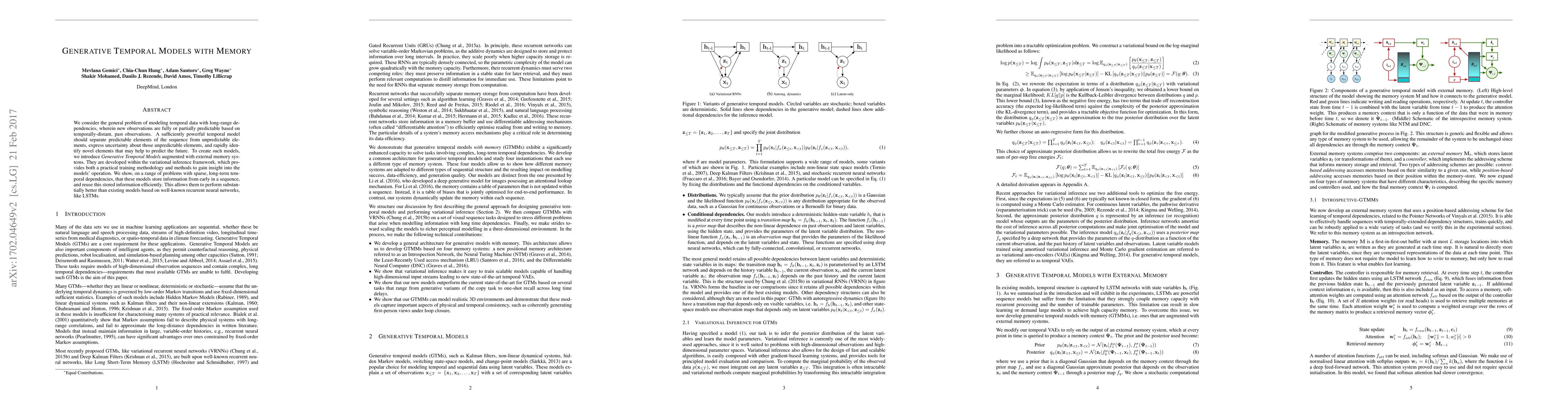 This paper introduces Generative Temporal Models with external memory systems to handle long-range dependencies in temporal data. These models, developed within a variational inference framework, outperform existing RNN-based models like LSTMs by efficiently storing and reusing early sequence information.