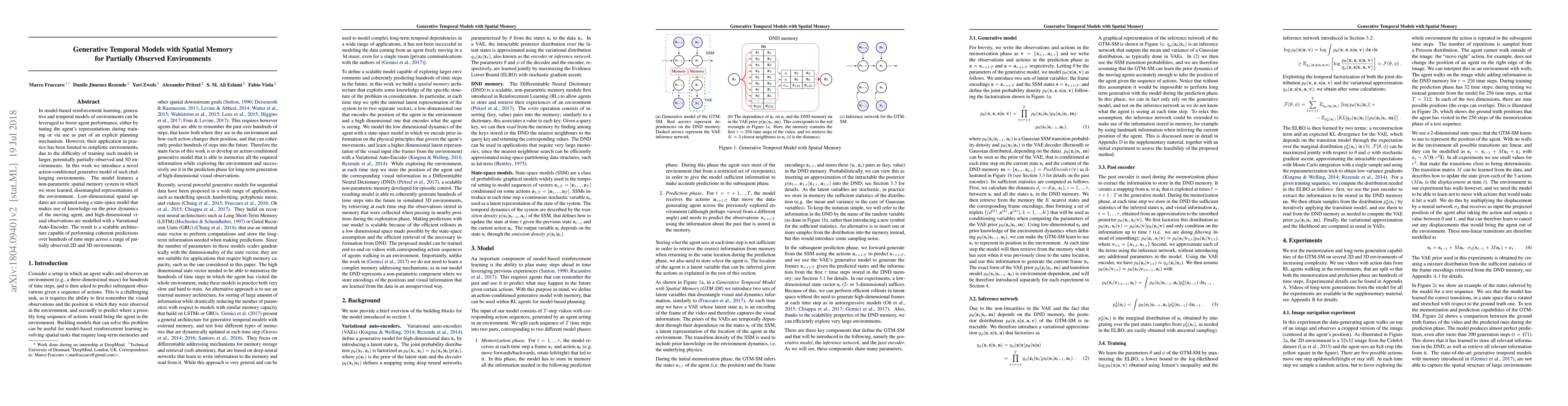 This paper introduces a scalable generative temporal model with spatial memory for partially observed environments, combining a non-parametric spatial memory system and a state-space model to handle complex dynamics, enabling coherent predictions over long time frames in both 2D and 3D settings.