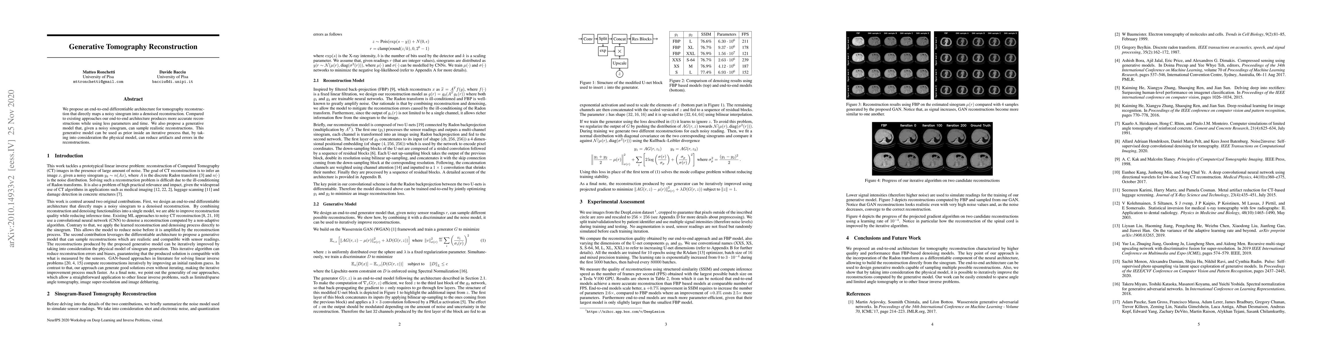 We propose an end-to-end differentiable architecture for tomography reconstruction that directly maps a noisy sinogram into a denoised reconstruction. Compared to existing approaches our end-to-end architecture produces more accurate reconstructions while using less parameters and time. We also propose a generative model that, given a noisy sinogram, can sample realistic reconstructions. This generative model can be used as prior inside an iterative process that, by taking into consideration the physical model, can reduce artifacts and errors in the reconstructions.