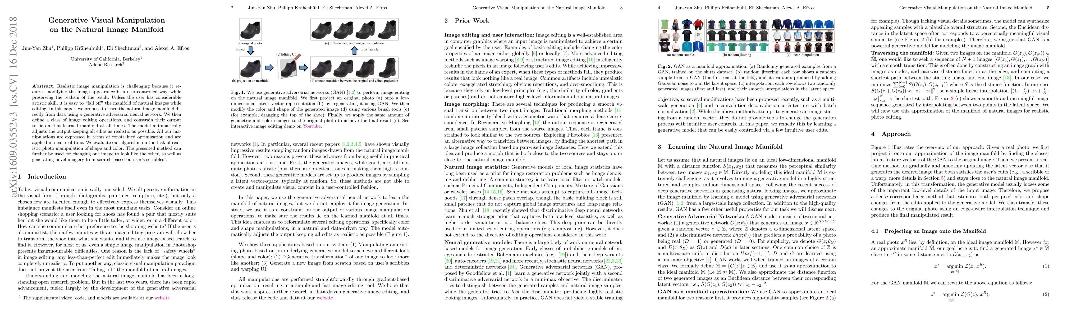 Researchers propose a generative adversarial neural network to learn and manipulate natural images in a realistic way, enabling users to edit images without losing realism. The model automatically adjusts edits to produce near-real-time results that can be used for photo manipulation, image-to-image translation, and novel imagery generation.