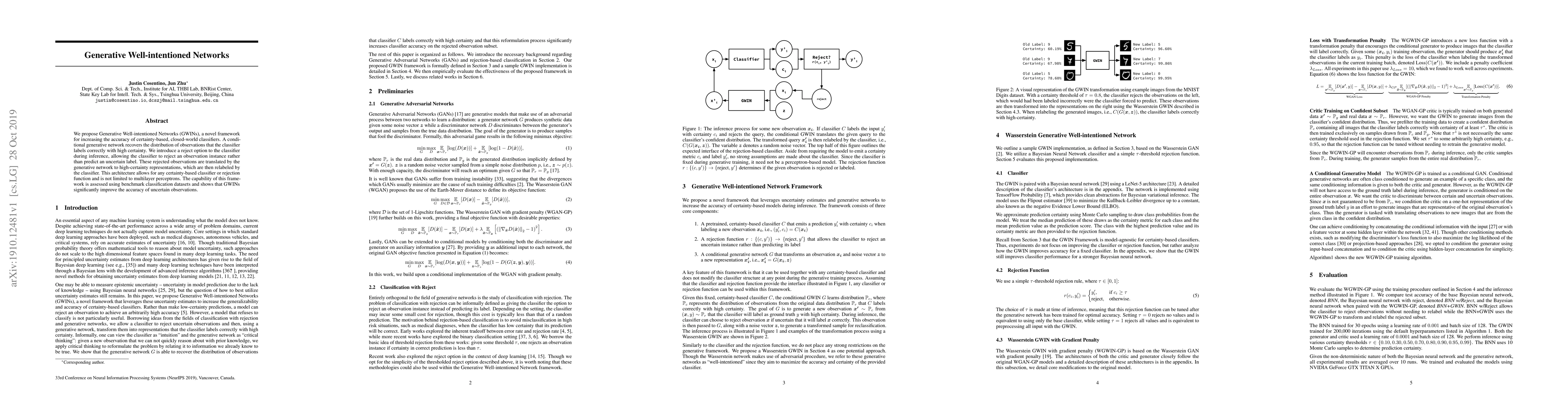 Generative Well-intentioned Networks improve certainty-based classifier accuracy by generating high-certainty representations for rejected observations, significantly improving performance on benchmark classification datasets.