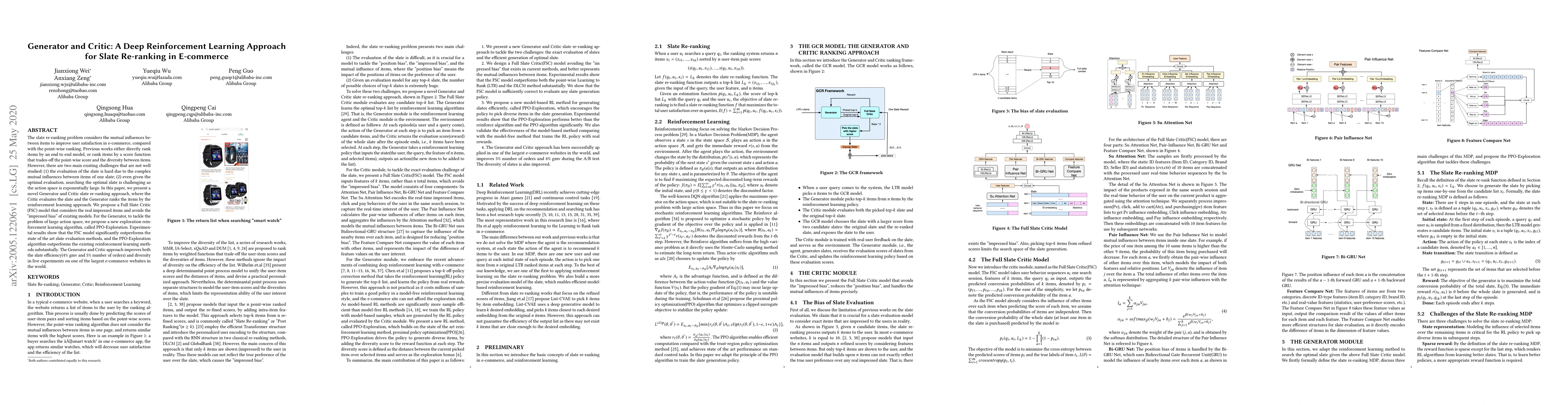 The slate re-ranking problem considers the mutual influences between items to improve user satisfaction in e-commerce, compared with the point-wise ranking. Previous works either directly rank items by an end to end model, or rank items by a score function that trades-off the point-wise score and the diversity between items. However, there are two main existing challenges that are not well studied: (1) the evaluation of the slate is hard due to the complex mutual influences between items of one slate; (2) even given the optimal evaluation, searching the optimal slate is challenging as the action space is exponentially large. In this paper, we present a novel Generator and Critic slate re-ranking approach, where the Critic evaluates the slate and the Generator ranks the items by the reinforcement learning approach. We propose a Full Slate Critic (FSC) model that considers the real impressed items and avoids the impressed bias of existing models. For the Generator, to tackle the problem of large action space, we propose a new exploration reinforcement learning algorithm, called PPO-Exploration. Experimental results show that the FSC model significantly outperforms the state of the art slate evaluation methods, and the PPO-Exploration algorithm outperforms the existing reinforcement learning methods substantially. The Generator and Critic approach improves both the slate efficiency(4% gmv and 5% number of orders) and diversity in live experiments on one of the largest e-commerce websites in the world.