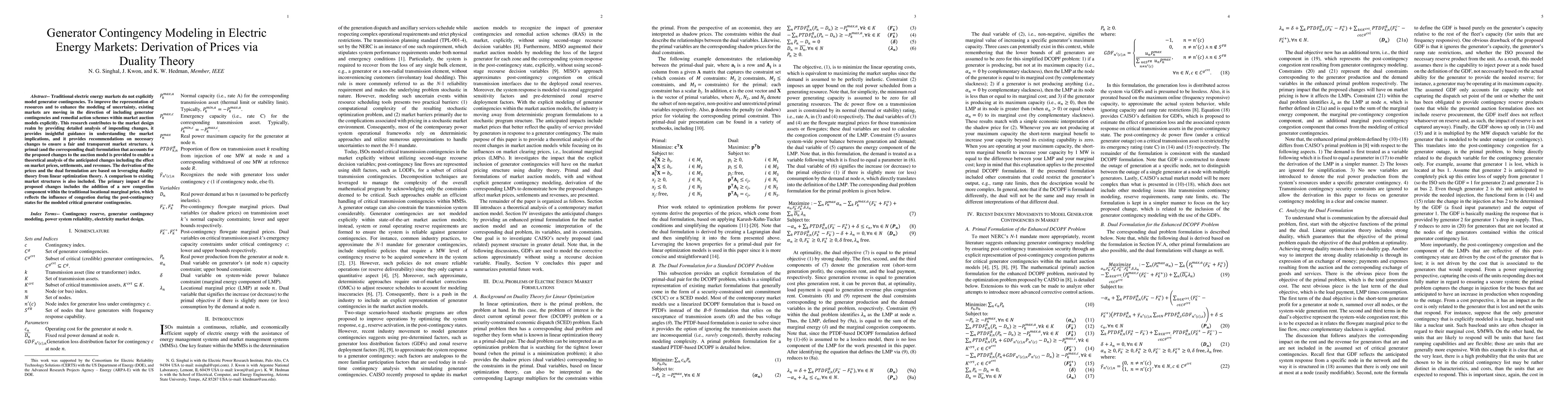 Traditional electric energy markets do not explicitly model generator contingencies. To improve the representation of resources and to enhance the modeling of uncertainty, existing markets are moving in the direction of including generator contingencies and remedial action schemes within market auction models explicitly. This research contributes to the market design realm by providing detailed analysis of impending changes, it provides insightful guidance in understanding the market implications, and it provides recommendations on necessary changes to ensure a fair and transparent market structure. A primal (and the corresponding dual) formulation that accounts for the proposed changes to the auction model is provided to enable a theoretical analysis of the anticipated changes including the effect on market prices, settlements, and revenues. The derivation of the prices and the dual formulation are based on leveraging duality theory from linear optimization theory. A comparison to existing market structures is also included. The primary impact of the proposed changes includes the addition of a new congestion component within the traditional locational marginal price, which reflects the influence of congestion during the post-contingency states for the modeled critical generator contingencies.