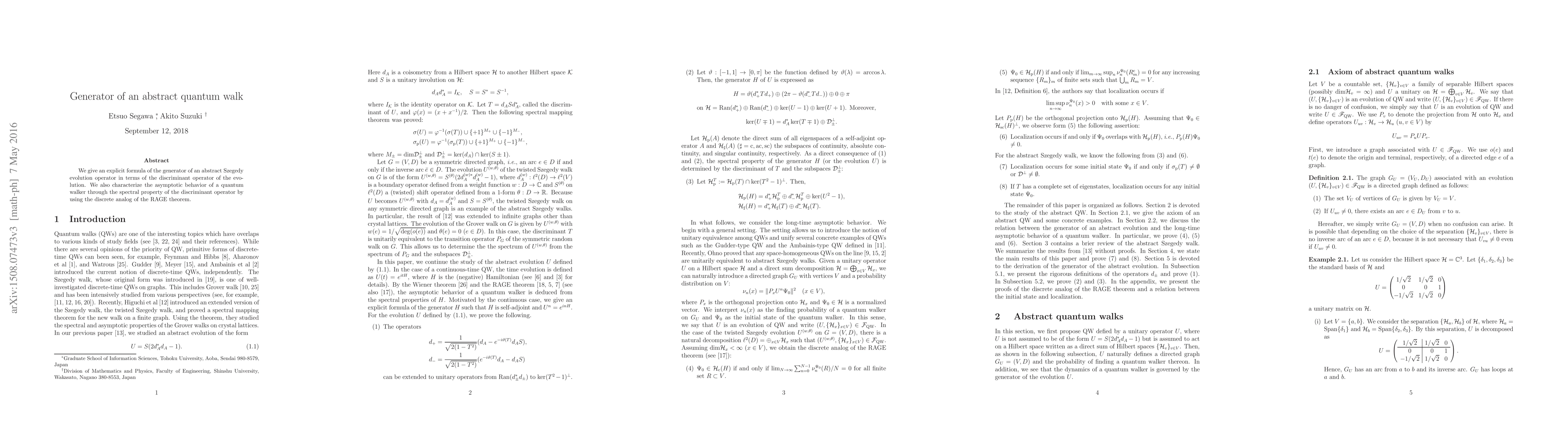 This paper explores an abstract quantum walk defined by a unitary operator $U$ acting on a Hilbert space, showing it defines a directed graph $G_U$ and the probability distribution of a quantum walker. The study derives the generator $H$ of $U$ and generalizes the Szegedy evolution operator using a boundary operator $d_A$ and a shift operator $S$.