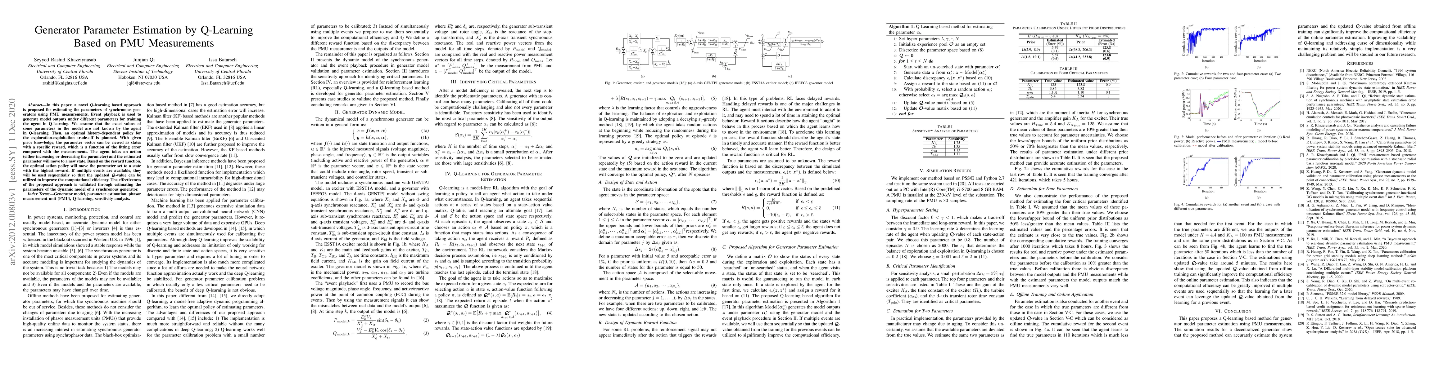 This paper proposes a Q-learning based method for estimating synchronous generator parameters using PMU measurements, employing event playback to train the agent. The approach optimizes the exploration-exploitation trade-off to minimize the fitting error between the model and measurements, validated through parameter estimation for a dynamic generator model.