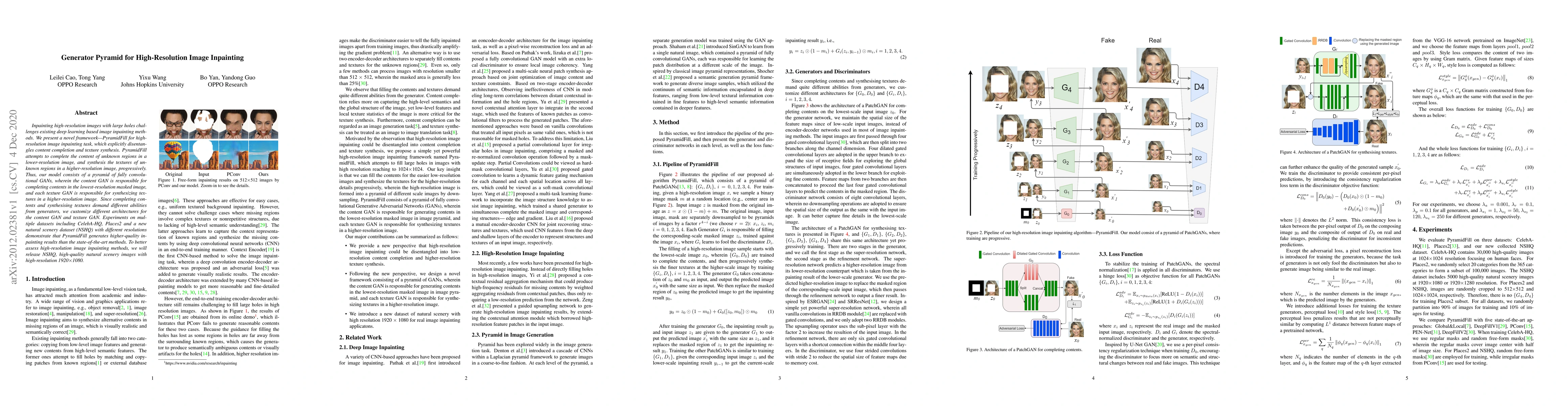 The PyramidFill framework disentangles content completion and texture synthesis for high-resolution image inpainting using a pyramid of GANs, achieving superior results compared to state-of-the-art methods. The new NSHQ dataset, featuring high-resolution natural scenery images, will be released to facilitate further research in this area.