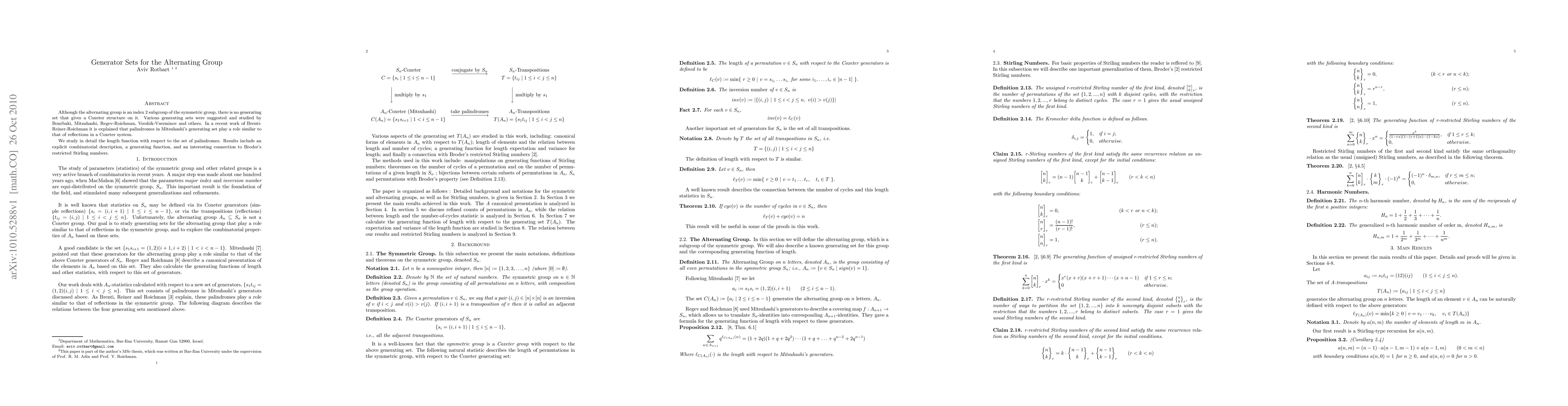 Researchers studied a generating set for the alternating group, discovering an explicit combinatorial description and connection to Broder's restricted Stirling numbers, providing new insights into its properties.