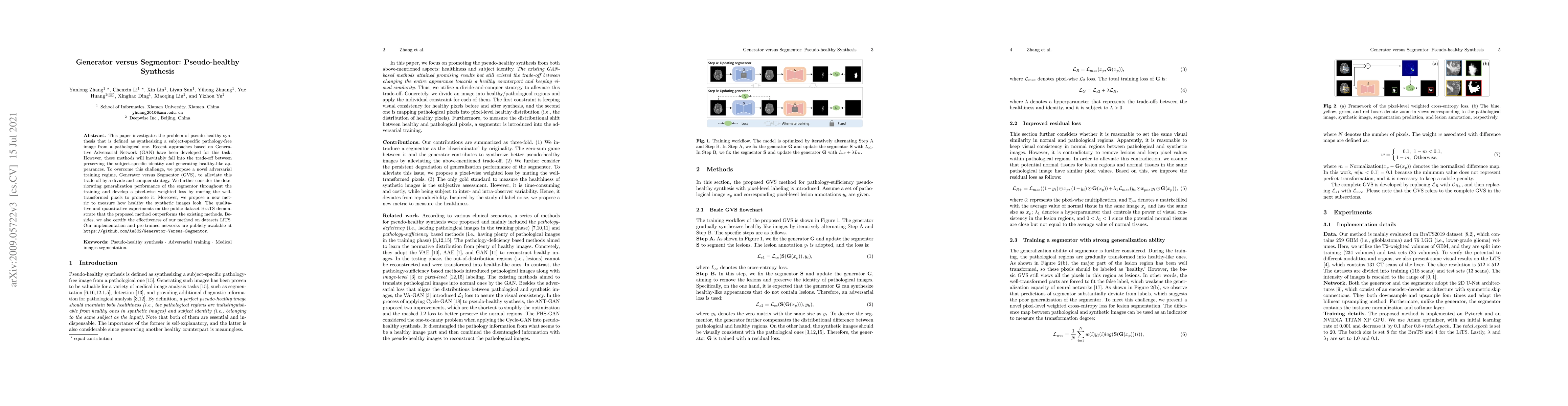 This paper investigates the problem of pseudo-healthy synthesis that is defined as synthesizing a subject-specific pathology-free image from a pathological one. Recent approaches based on Generative Adversarial Network (GAN) have been developed for this task. However, these methods will inevitably fall into the trade-off between preserving the subject-specific identity and generating healthy-like appearances. To overcome this challenge, we propose a novel adversarial training regime, Generator versus Segmentor (GVS), to alleviate this trade-off by a divide-and-conquer strategy. We further consider the deteriorating generalization performance of the segmentor throughout the training and develop a pixel-wise weighted loss by muting the well-transformed pixels to promote it. Moreover, we propose a new metric to measure how healthy the synthetic images look. The qualitative and quantitative experiments on the public dataset BraTS demonstrate that the proposed method outperforms the existing methods. Besides, we also certify the effectiveness of our method on datasets LiTS. Our implementation and pre-trained networks are publicly available at https://github.com/Au3C2/Generator-Versus-Segmentor.