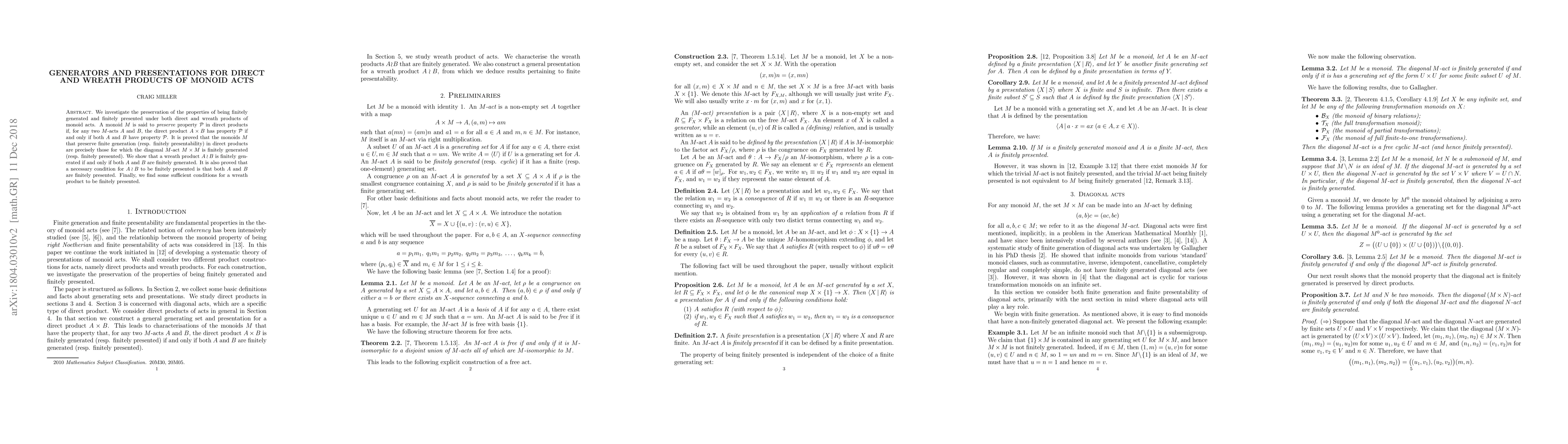 This paper explores how properties of finite generation and finite presentability in monoid acts are preserved under direct and wreath products. It concludes that monoids preserving these properties in direct products must have a finitely generated (or presented) diagonal act, and that wreath products require both factors to be finitely generated, with additional conditions for finite presentability.