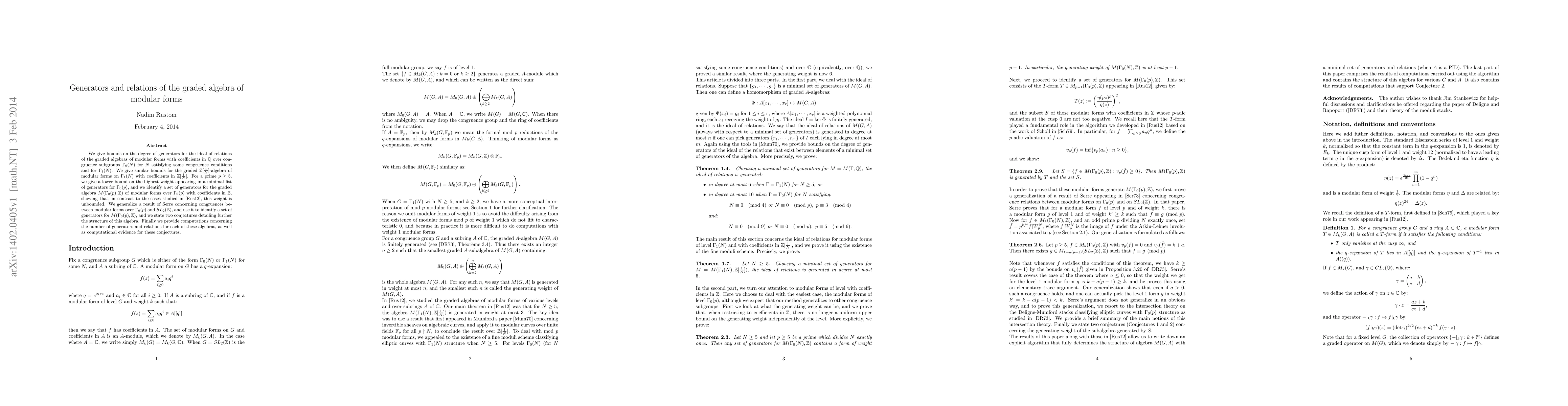 This paper provides bounds on the degree of generators for the ideal of relations in graded algebras of modular forms over congruence subgroups $\Gamma_0(N)$ and $\Gamma_1(N)$. It identifies a set of generators for the graded algebra $M(\Gamma_0(p),\mathbb{Z})$ and discusses the structure of this algebra, including conjectures and computational evidence.