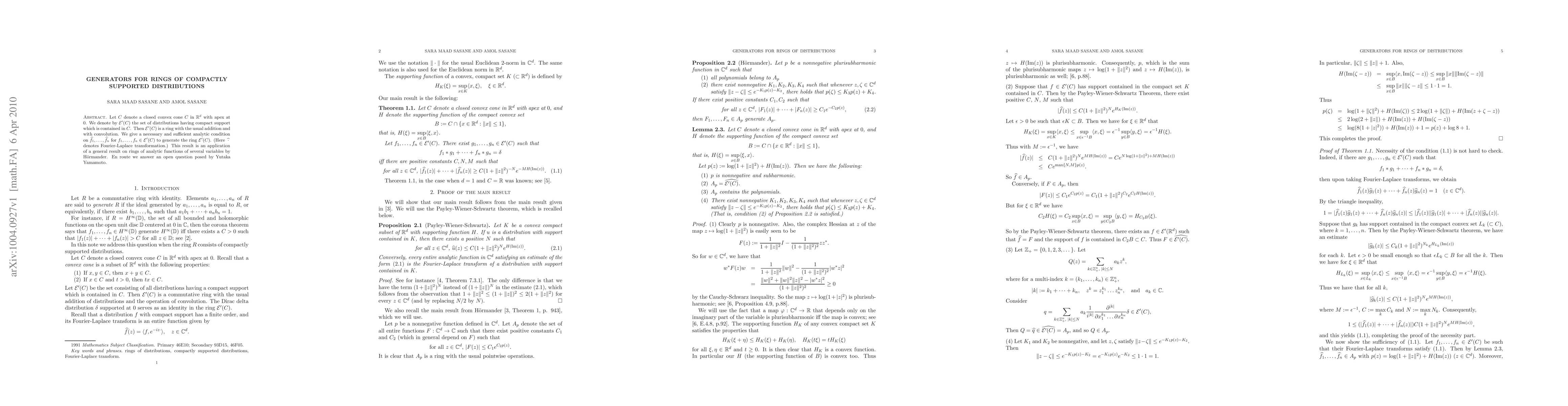 Let $C$ denote a closed convex cone $C$ in $\mathbb{R}^d$ with apex at 0. We denote by $\mathcal{E}'(C)$ the set of distributions having compact support which is contained in $C$. Then $\mathcal{E}'(C)$ is a ring with the usual addition and with convolution. We give a necessary and sufficient analytic condition on $\hat{f}_1,..., \hat{f}_n$ for $f_1,...,f_n \in \mathcal{E}'(C)$ to generate the ring $\mathcal{E}'(C)$. (Here $\hat{\cdot}$ denotes Fourier-Laplace transformation.) This result is an application of a general result on rings of analytic functions of several variables by H\"ormander. En route we answer an open question posed by Yutaka Yamamoto.