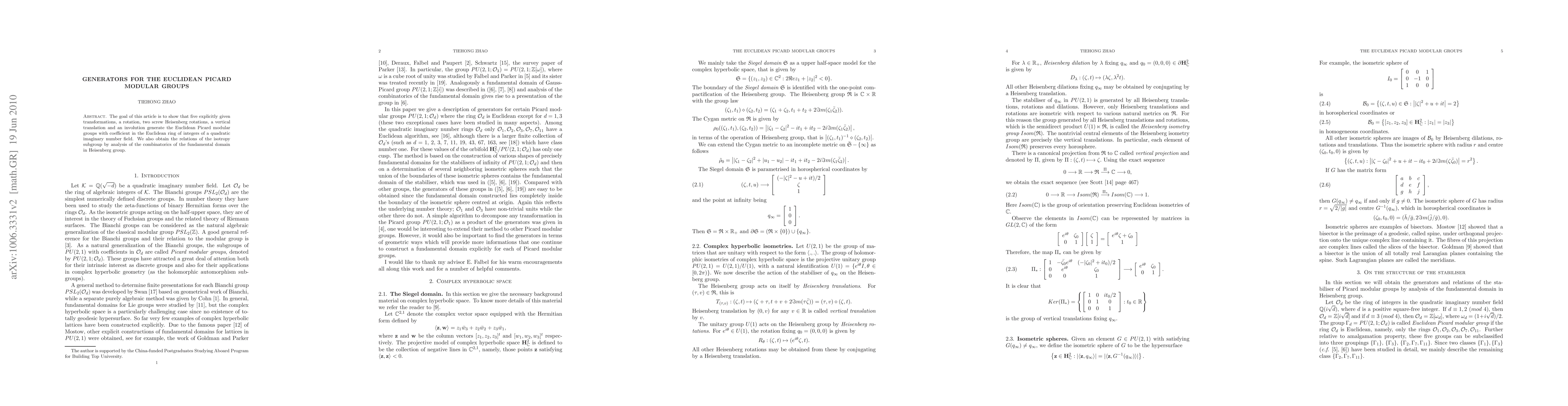 The goal of this article is to show that five explicitly given transformations, a rotation, two screw Heisenberg rotations, a vertical translation and an involution generate the Euclidean Picard modular groups with coefficient in the Euclidean ring of integers of a quadratic imaginary number field. We also obtain the relations of the isotropy subgroup by analysis of the combinatorics of the fundamental domain in Heisenberg group.