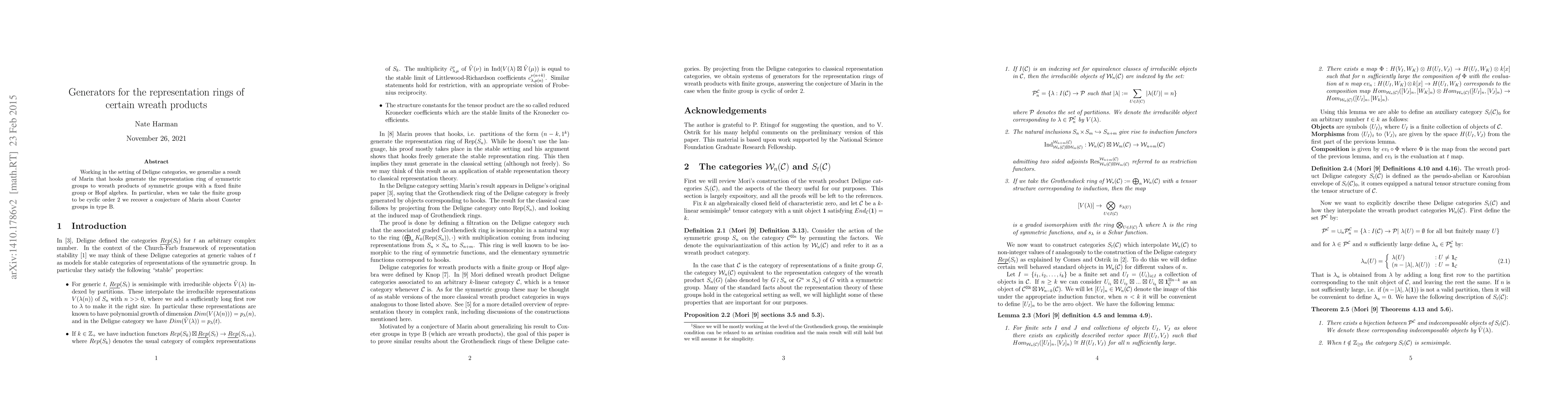 Working in the setting of Deligne categories, we generalize a result of Marin that hooks generate the representation ring of symmetric groups to wreath products of symmetric groups with a fixed finite group or Hopf algebra. In particular, when we take the finite group to be cyclic order 2 we recover a conjecture of Marin about Coxeter groups in type B.