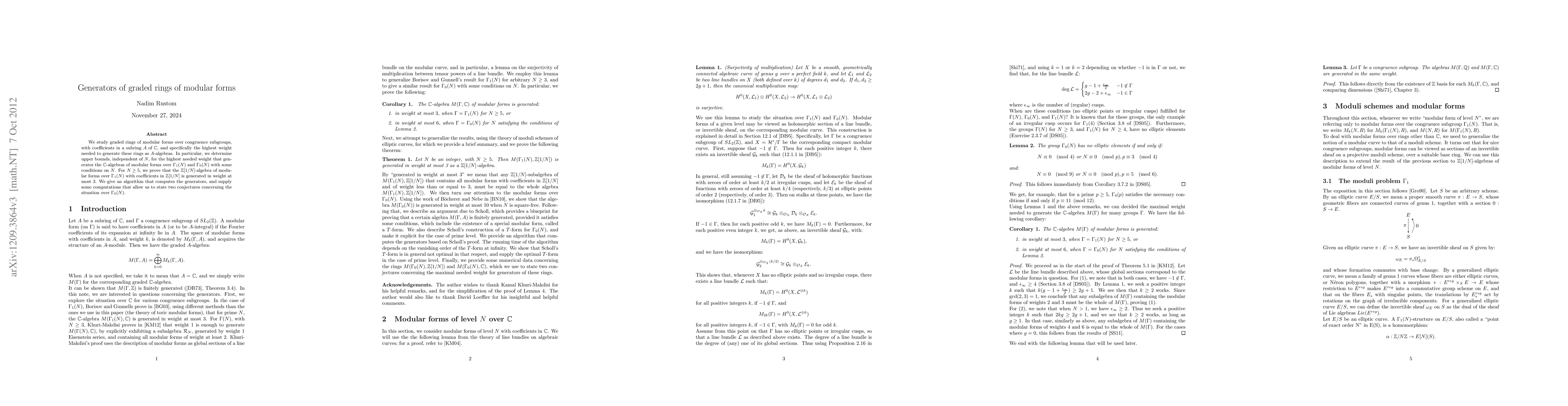 This paper investigates graded rings of modular forms over various congruence subgroups, determining the highest weight necessary to generate these rings as $A$-algebras. It provides upper bounds for the generating weights independent of $N$ and proves that for $N \geq 5$, the $\mathbb{Z}[1/N]$-algebra of modular forms over $\Gamma_1(N)$ is generated by weights at most 3.