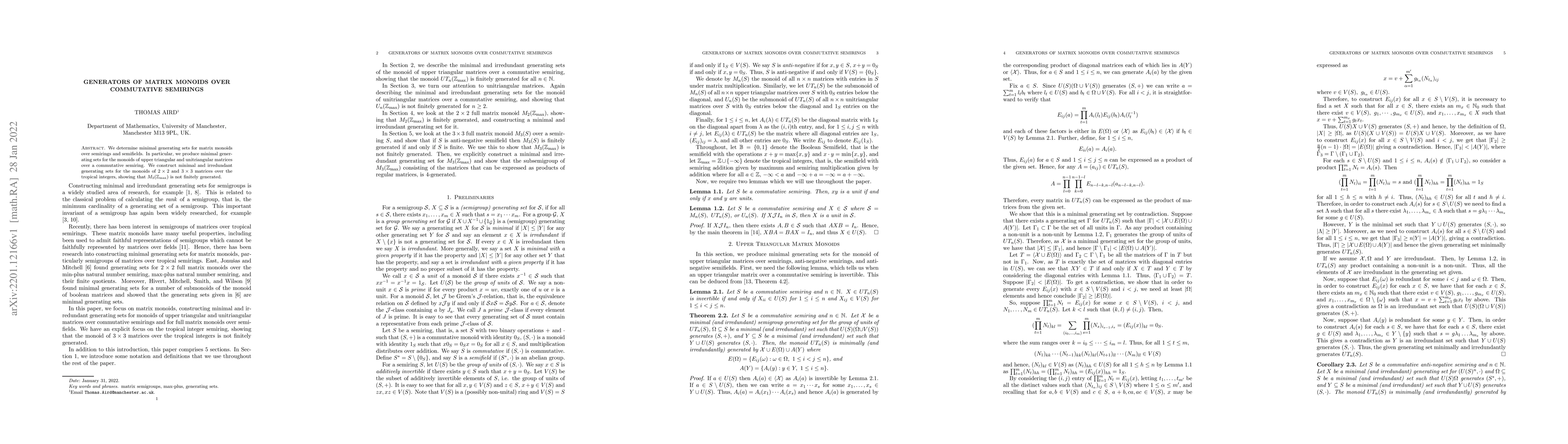 This paper identifies minimal generating sets for matrix monoids over commutative semirings and semifields, specifically focusing on upper triangular and unitriangular matrices. It also constructs minimal generating sets for $2 \times 2$ and $3 \times 3$ matrices over tropical integers, revealing that $M_3(\mathbb{Z}_\mathrm{max})$ is not finitely generated.