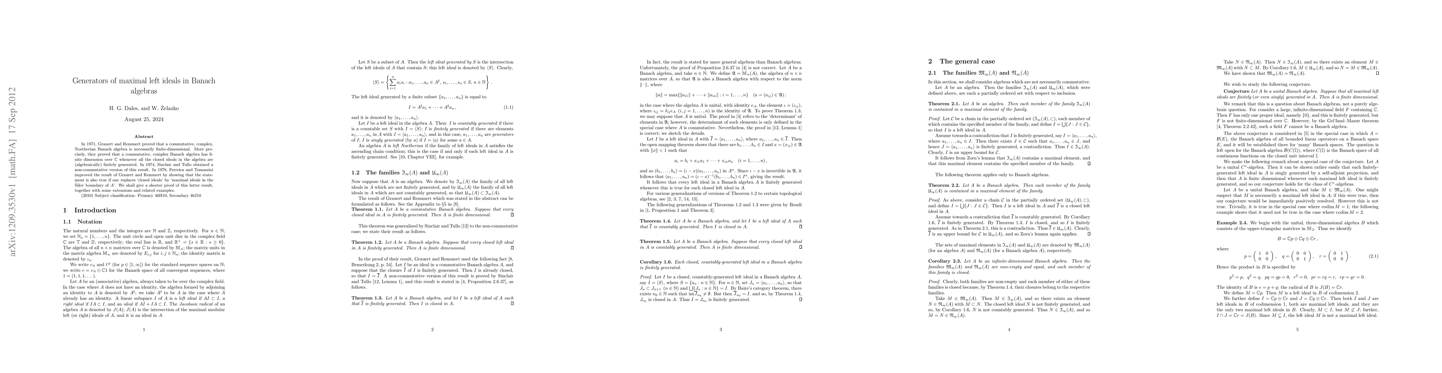 In 1971, Grauert and Remmert proved that a commutative, complex, Noetherian Banach algebra is necessarily finite-dimensional. More precisely, they proved that a commutative, complex Banach algebra has finite dimension over $\C$ whenever all the closed ideals in the algebra are (algebraically) finitely generated. In 1974, Sinclair and Tullo obtained a non-commutative version of this result. In 1978, Ferreira and Tomassini improved the result of Grauert and Remmert by showing that the statement is also true if one replaces `closed ideals' by `maximal ideals in the \v{S}ilov boundary of $A$'. We shall give a shorter proof of this latter result, together with some extensions and related examples.