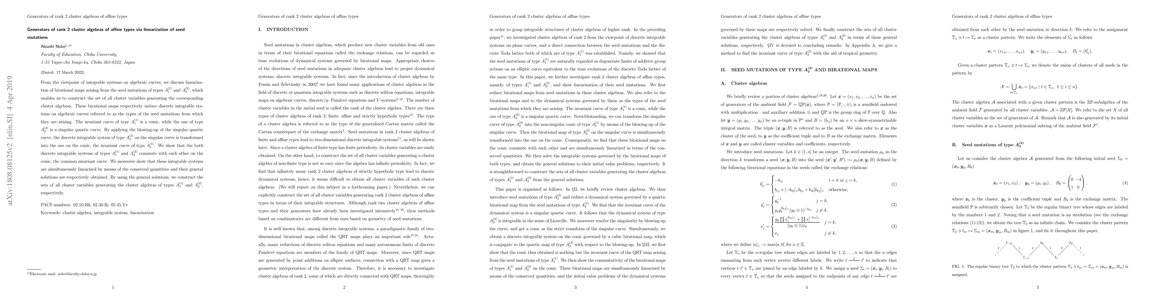 From the viewpoint of integrable systems on algebraic curves, we discuss linearization of birational maps arising from the seed mutations of types $A^{(1)}_1$ and $A^{(2)}_2$, which enables us to construct the set of all cluster variables generating the corresponding cluster algebras. These birational maps respectively induce discrete integrable systems on algebraic curves referred to as the types of the seed mutations from which they are arising. The invariant curve of type $A^{(1)}_1$ is a conic, while the one of type $A^{(2)}_2$ is a singular quartic curve. By applying the blowing-up of the singular quartic curve, the discrete integrable system of type $A^{(2)}_2$ on the singular curve is transformed into the one on the conic, the invariant curve of type $A^{(1)}_1$. We show that the both discrete integrable systems of types $A^{(1)}_1$ and $A^{(2)}_2$ commute with each other on the conic, the common invariant curve. We moreover show that these integrable systems are simultaneously linearized by means of the conserved quantities and their general solutions are respectively obtained. By using the general solutions, we construct the sets of all cluster variables generating the cluster algebras of types $A^{(1)}_1$ and $A^{(2)}_2$, respectively.