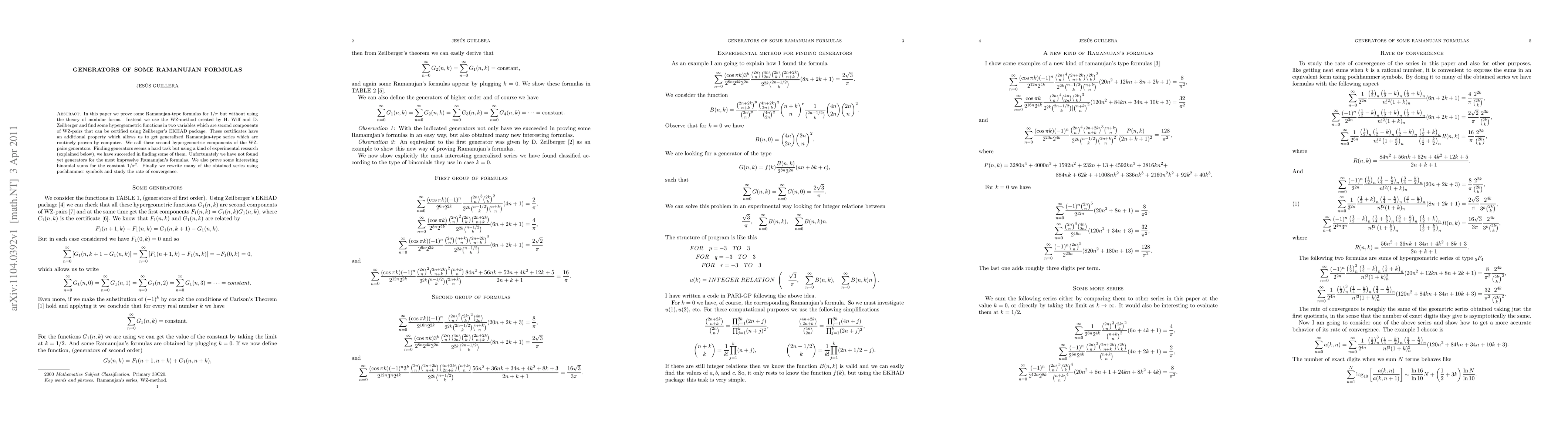 This paper proves Ramanujan-type formulas for $1/\pi$ using the WZ-method and hypergeometric functions in two variables, identifying them as generators. It also explores binomial sums for $1/\pi^2$ and studies the convergence rate of the derived series.