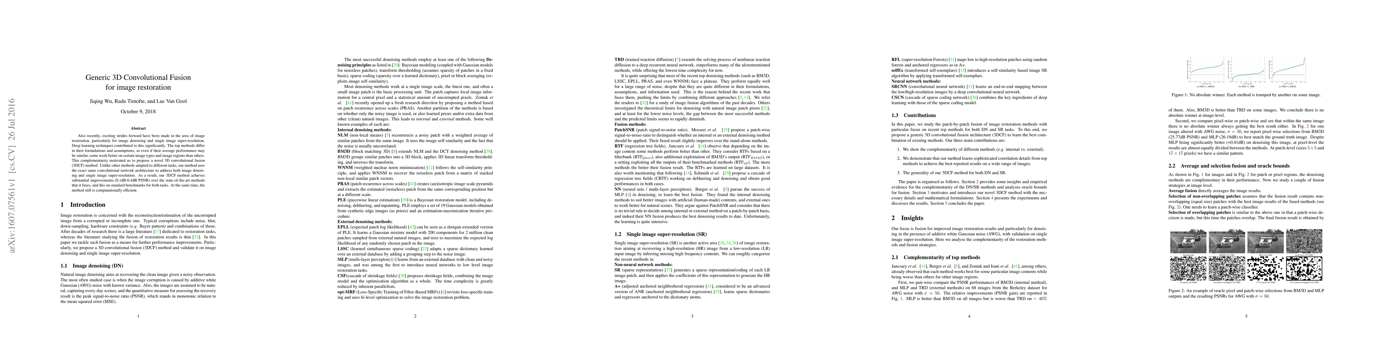 This research introduces a novel 3D convolutional fusion (3DCF) method for image restoration, achieving significant improvements in both image denoising and super-resolution tasks compared to state-of-the-art methods. The method uses a consistent convolutional network architecture for both tasks, ensuring computational efficiency.