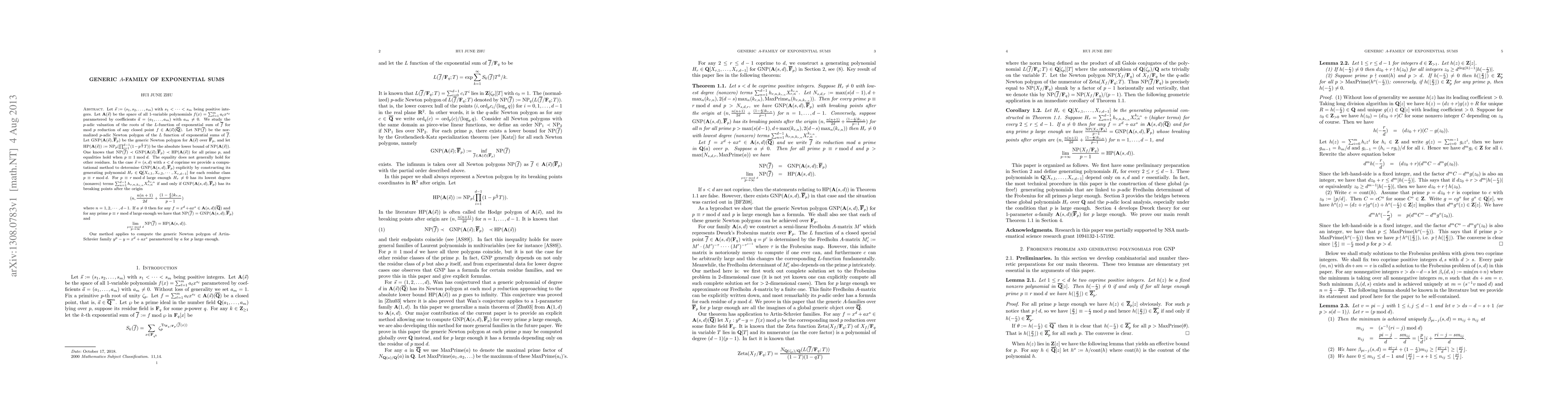 In this paper we construct a generating polynomial over the rationals for the generic Newton polygon for the L function of exponential sums of the family of f = x^d+ a x^s parameterized by a, and prove some of its key properties. The generating polynomial encodes information of and determines the generic Newton polygon at each prime p when p is large enough, and vice versa.