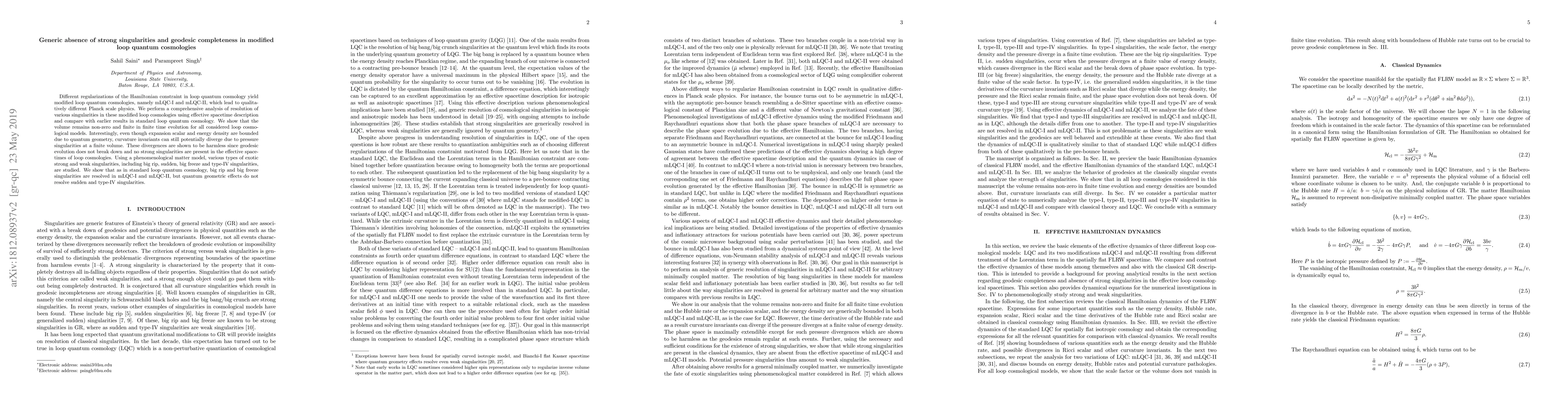 This research paper investigates modified loop quantum cosmologies (mLQC-I and mLQC-II) to demonstrate the absence of strong singularities and geodesic completeness, showing that while quantum geometry prevents big rip and big freeze singularities, it does not resolve sudden and type-IV singularities. The volume remains finite in finite time evolution, and geodesic evolution remains unbroken.