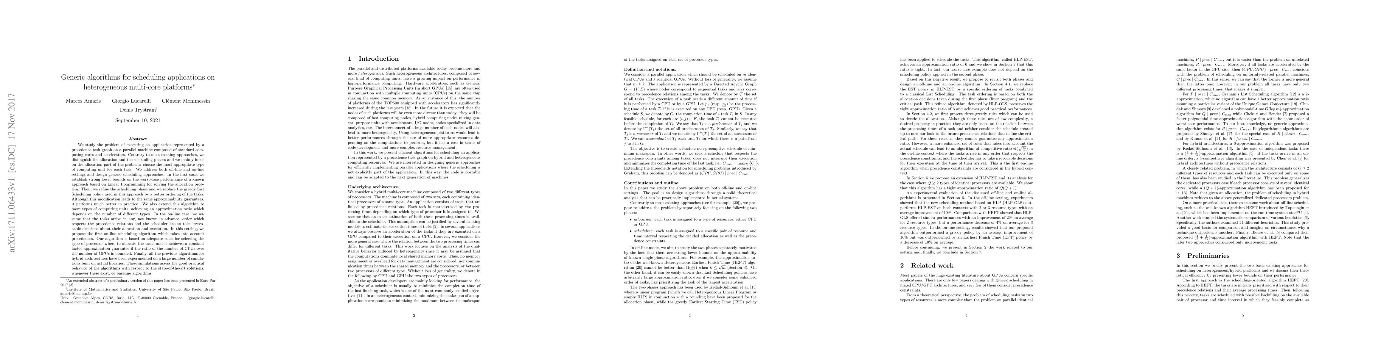 We study the problem of executing an application represented by a precedence task graph on a parallel machine composed of standard computing cores and accelerators. Contrary to most existing approaches, we distinguish the allocation and the scheduling phases and we mainly focus on the allocation part of the problem: choose the most appropriate type of computing unit for each task. We address both off-line and on-line settings and design generic scheduling approaches. In the first case, we establish strong lower bounds on the worst-case performance of a known approach based on Linear Programming for solving the allocation problem. Then, we refine the scheduling phase and we replace the greedy List Scheduling policy used in this approach by a better ordering of the tasks. Although this modification leads to the same approximability guarantees, it performs much better in practice. We also extend this algorithm to more types of computing units, achieving an approximation ratio which depends on the number of different types. In the on-line case, we assume that the tasks arrive in any, not known in advance, order which respects the precedence relations and the scheduler has to take irrevocable decisions about their allocation and execution. In this setting, we propose the first on-line scheduling algorithm which takes into account precedences. Our algorithm is based on adequate rules for selecting the type of processor where to allocate the tasks and it achieves a constant factor approximation guarantee if the ratio of the number of CPUs over the number of GPUs is bounded. Finally, all the previous algorithms for hybrid architectures have been experimented on a large number of simulations built on actual libraries. These simulations assess the good practical behavior of the algorithms with respect to the state-of-the-art solutions, whenever these exist, or baseline algorithms.