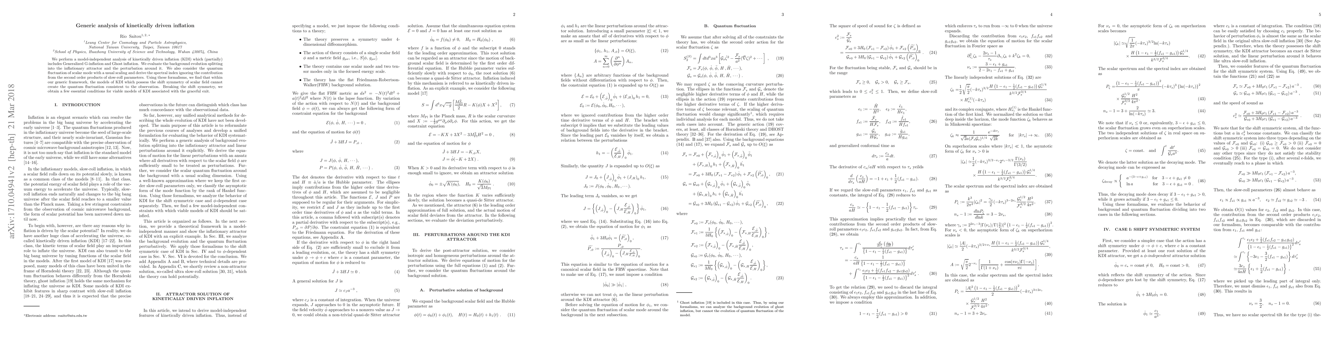 We perform a model-independent analysis of kinetically driven inflation (KDI) which (partially) includes Generalized G-inflation and Ghost inflation. We evaluate the background evolution splitting into the inflationary attractor and the perturbation around it. We also consider the quantum fluctuation of scalar mode with a usual scaling and derive the spectral index ignoring the contribution from the second order products of slow-roll parameters. Using these formalisms, we find that within our generic framework, the models of KDI which possess the shift symmetry of scalar field cannot create the quantum fluctuation consistent to the observation. Breaking the shift symmetry, we obtain a few essential conditions for viable models of KDI associated with the graceful exit.