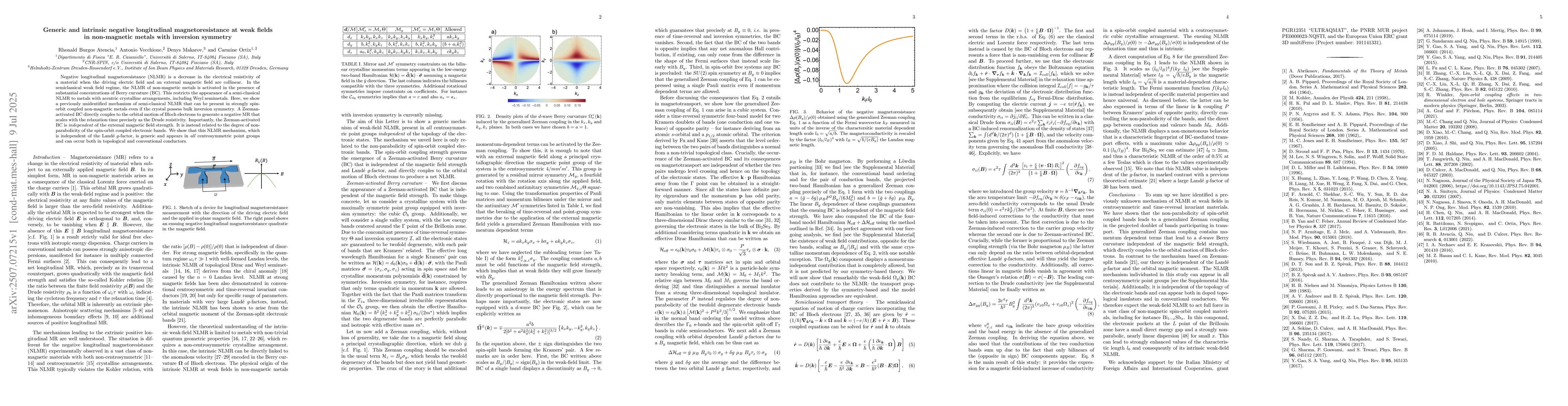 This research identifies a new mechanism for negative longitudinal magnetoresistance (NLMR) in non-magnetic metals with inversion symmetry, which was previously thought to only occur in acentric crystals. The NLMR is caused by Zeeman-activated Berry curvature, independent of magnetic field strength, and is linked to band non-parabolicity. This effect is generic across all centrosymmetric point groups, affecting both topological and conventional conductors.