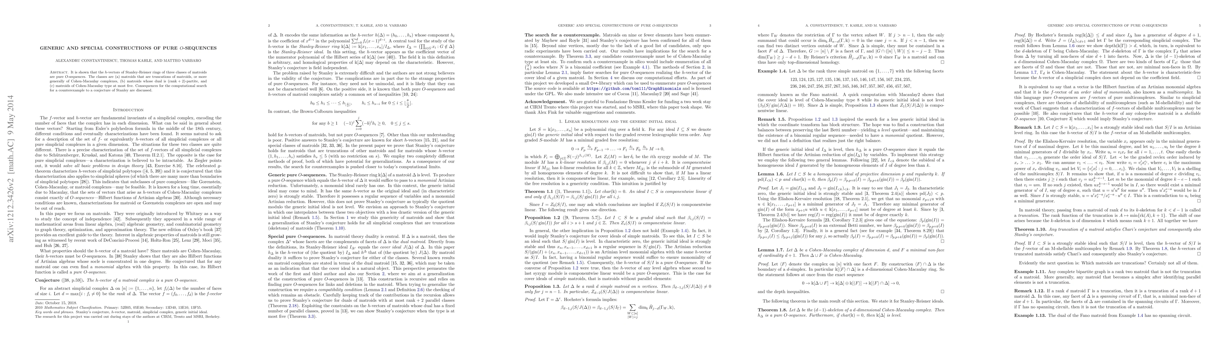 It is shown that the h-vectors of Stanley-Reisner rings of three classes of matroids are pure O-sequences. The classes are (a) matroids that are truncations of other matroids, or more generally of Cohen-Macaulay complexes, (b) matroids whose dual is (rank + 2)-partite, and (c) matroids of Cohen-Macaulay type at most five. Consequences for the computational search for a counterexample to a conjecture of Stanley are discussed.