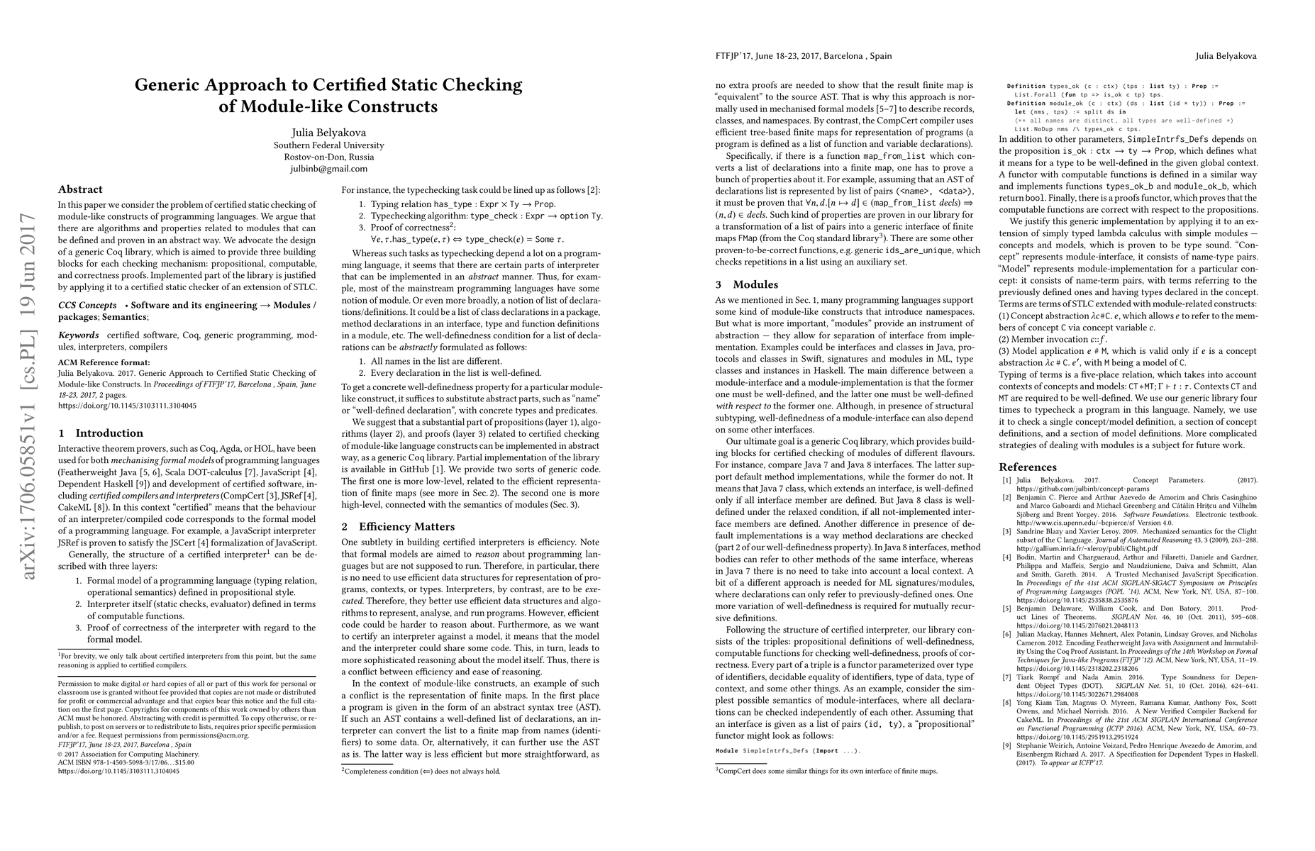 This paper proposes a generic approach to certified static checking of module-like constructs in programming languages, advocating for a Coq library with three building blocks: propositional, computable, and correctness proofs. An implemented part of the library is demonstrated through its application to a certified static checker for an extension of STLC.