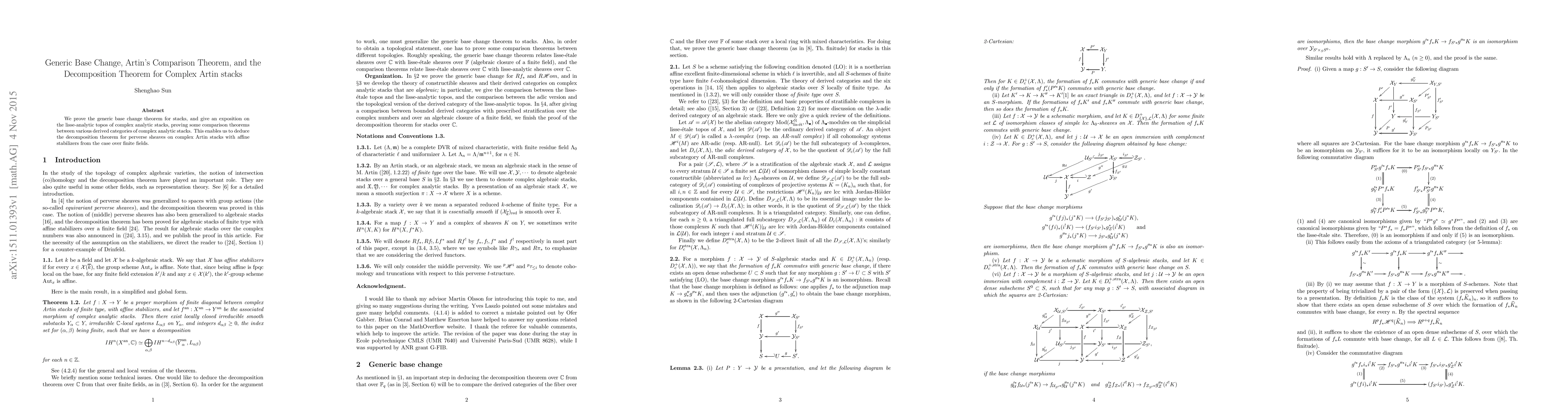 This paper proves the generic base change theorem for complex Artin stacks and establishes comparison theorems between derived categories, leading to the deduction of the decomposition theorem for perverse sheaves on such stacks with affine stabilizers from the finite field case.