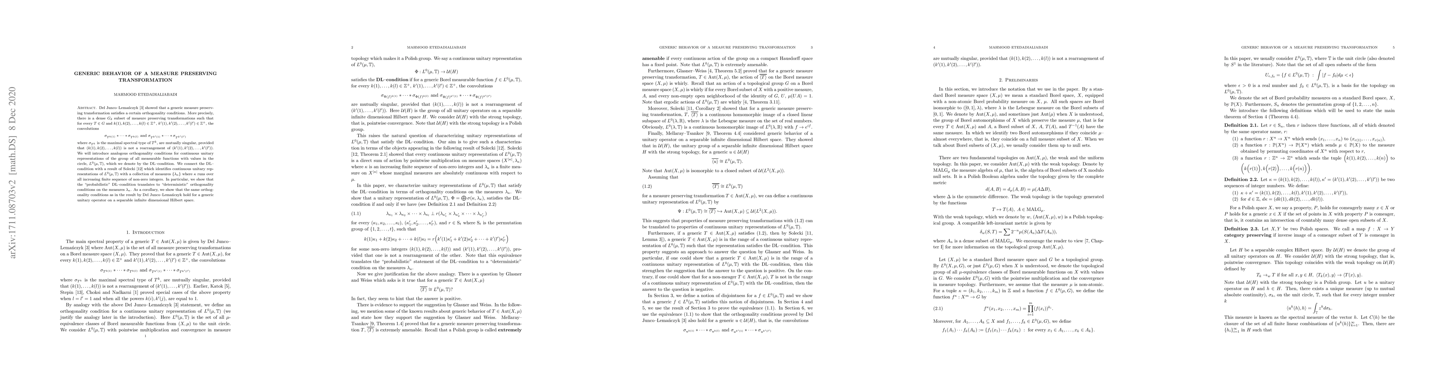 This paper explores the generic behavior of measure-preserving transformations, demonstrating that a dense $G_\delta$ subset satisfies orthogonality conditions for convolutions. It introduces a DL-condition for continuous unitary representations of $L^0(\mu,\mathbb{T})$ and connects it to Solecki's result on the structure of such representations, showing a translation from probabilistic to deterministic orthogonality conditions.