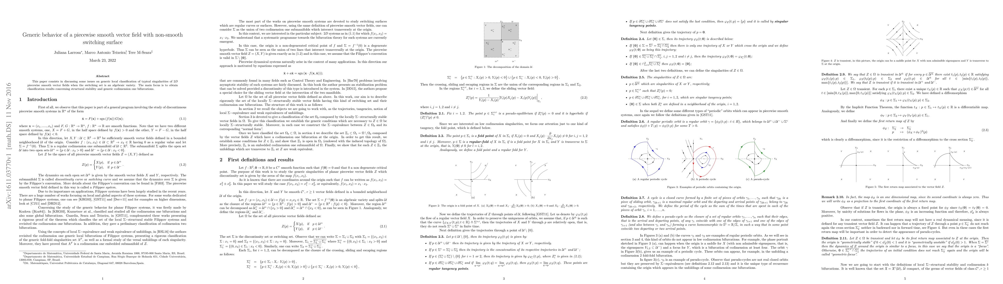 This paper consists in discussing some issues on generic local classification of typical singularities of $2D$ piecewise smooth vector fields when the switching set is an algebraic variety. The main focus is to obtain classification results concerning structural stability and generic codimension one bifurcations.