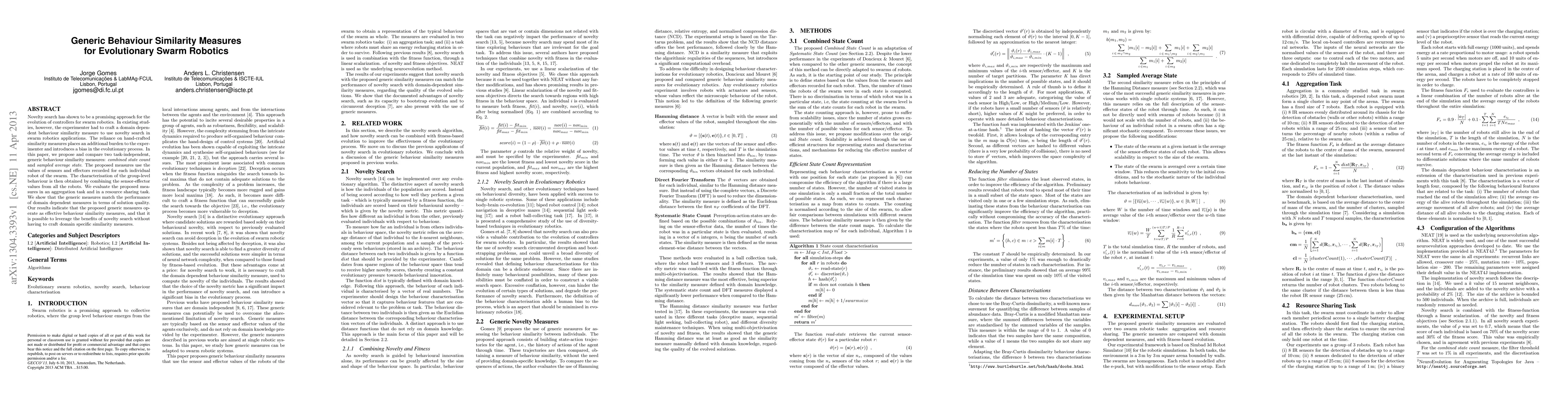 This paper proposes two generic behaviour similarity measures for evolutionary swarm robotics, eliminating the need for domain-specific measures. The measures, based on sensor and effector values, show comparable performance to domain-dependent ones in aggregation and resource sharing tasks.