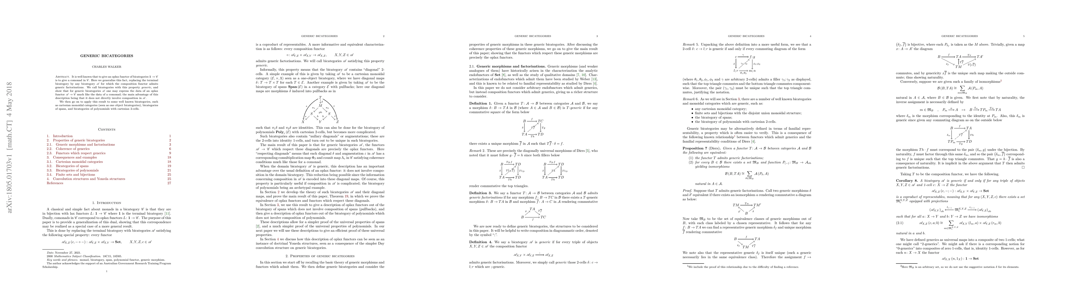 It is well known that to give an oplax functor of bicategories $\mathbf{1}\to\mathscr{C}$ is to give a comonad in $\mathscr{C}$. Here we generalize this fact, replacing the terminal bicategory by any bicategory $\mathscr{A}$ for which the composition functor admits generic factorisations. We call bicategories with this property generic, and show that for generic bicategories $\mathscr{A}$ one may express the data of an oplax functor $\mathscr{A}\to\mathscr{C}$ much like the data of a comonad; the main advantage of this description being that it does not directly involve composition in $\mathscr{A}$. We then go on to apply this result to some well known bicategories, such as cartesian monoidal categories (seen as one object bicategories), bicategories of spans, and bicategories of polynomials with cartesian 2-cells.