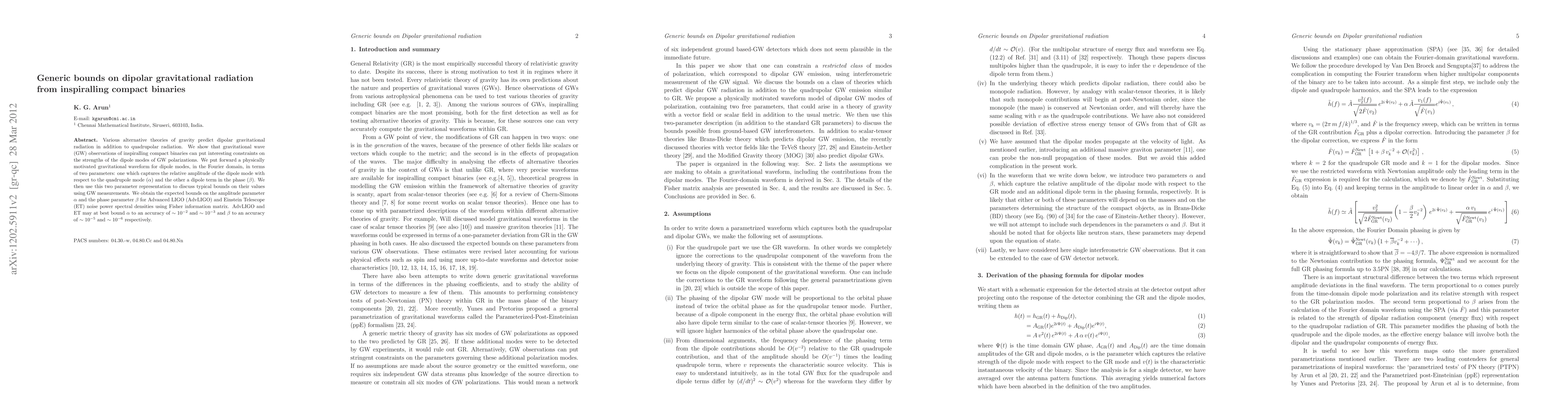 This paper investigates alternative gravity theories predicting dipolar gravitational radiation from inspiralling compact binaries, proposing a two-parameter gravitational waveform model. It uses Advanced LIGO and Einstein Telescope data to derive bounds on the dipole mode's amplitude and phase, finding potential limits of $\alpha \sim 10^{-2}$ and $\beta \sim 10^{-5}$ for LIGO, and $\alpha \sim 10^{-3}$ and $\beta \sim 10^{-6}$ for the Einstein Telescope.