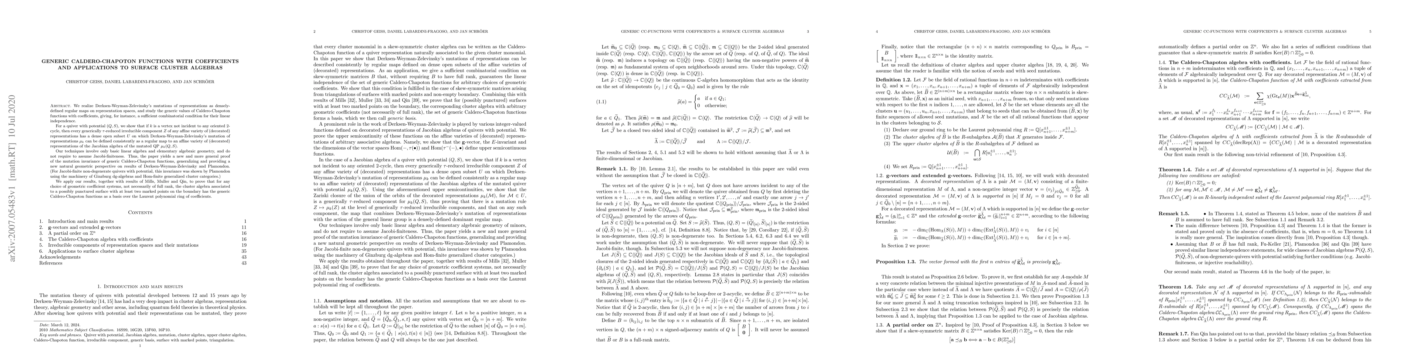 We realize Derksen-Weyman-Zelevinsky's mutations of representations as densely-defined regular maps on representation spaces, and study the generic values of Caldero-Chapoton functions with coefficients, giving, for instance, a sufficient combinatorial condition for their linear independence. For a quiver with potential $(Q,S)$, we show that if $k$ is a vertex not incident to any oriented 2-cycle, then every generically $\tau$-reduced irreducible component $Z$ of any affine variety of (decorated) representations has a dense open subset $U$ on which Derksen-Weyman-Zelevinsky's mutation of representations $\mu_k$ can be defined consistently as a regular map to an affine variety of (decorated) representations of the Jacobian algebra of the mutated QP $\mu_k(Q,S)$. Our techniques involve only basic linear algebra and elementary algebraic geometry, and do not require to assume Jacobi-finiteness. Thus, the paper yields a new and more general proof of the mutation invariance of generic Caldero-Chapoton functions, generalizing and providing a new natural geometric perspective on results of Derksen-Weyman-Zelevinsky and Plamondon. (For Jacobi-finite non-degenerate quivers with potential, this invariance was shown by Plamondon using the machinery of Ginzburg dg-algebras and Hom-finite generalized cluster categories.) We apply our results, together with results of Mills, Muller and Qin, to prove that for any choice of geometric coefficient systems, not necessarily of full rank, the cluster algebra associated to a possibly punctured surface with at least two marked points on the boundary has the generic Caldero-Chapoton functions as a basis over the Laurent polynomial ring of coefficients.