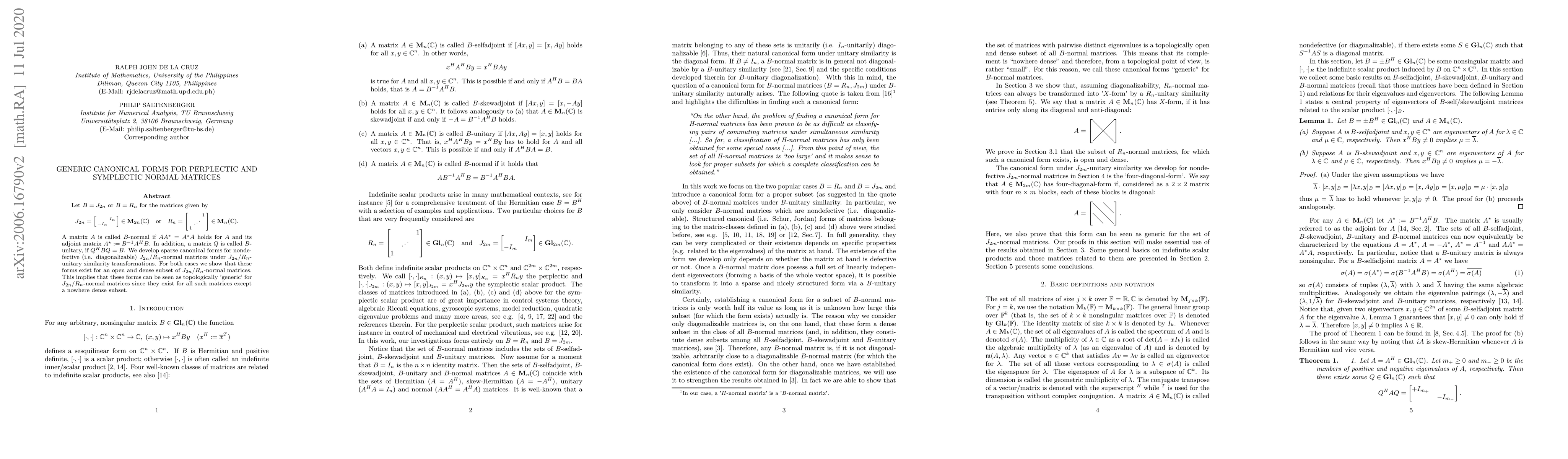 This paper develops sparse canonical forms for nondefective $J_{2n}$-normal and $R_n$-normal matrices under $J_{2n}$-unitary and $R_n$-unitary transformations, respectively. These canonical forms are shown to exist generically for an open and dense subset of such matrices.